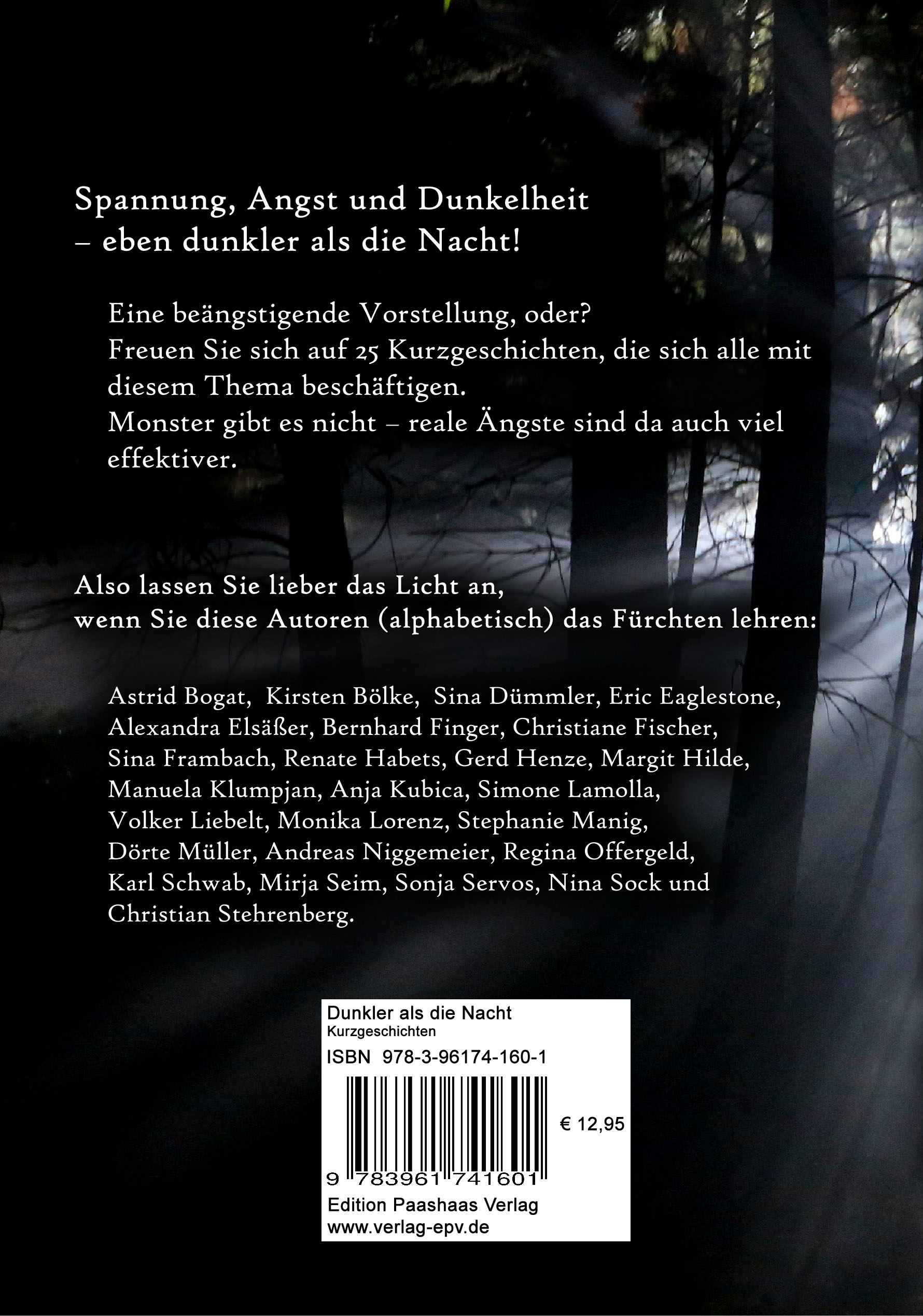 | Schlagworte | Angst • Anthologie • darkness • Dunkelheit • Edition Paashaas Verlag • Kurzgeschichten • Manuela Klumpjan • Psychologie • reale Ängste • Short-Storys • Spannung • Thriller |