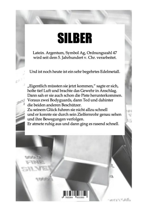 Silber war schon immer und ist noch heute ein sehr begehrtes Edelmetall.Im Schatten von Gold und Diamanten wird seit der Antike um das Silber gerungen. Dies ist bis heute so geblieben, und die Mächtigen teilen sich die Welt des Silbers auf.Lehnt sich ein kleines Unternehmen dagegen auf, hat das seine Konsequenzen, und sie müssen alles unternehmen, um sich gegen die Grossen zu behaupten.Auch mit unkonventionellen Mitteln und Hilfe von Freunden.