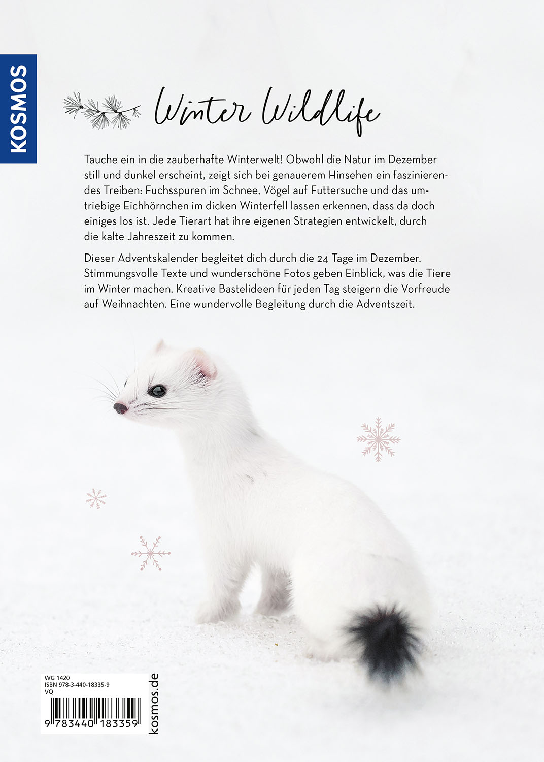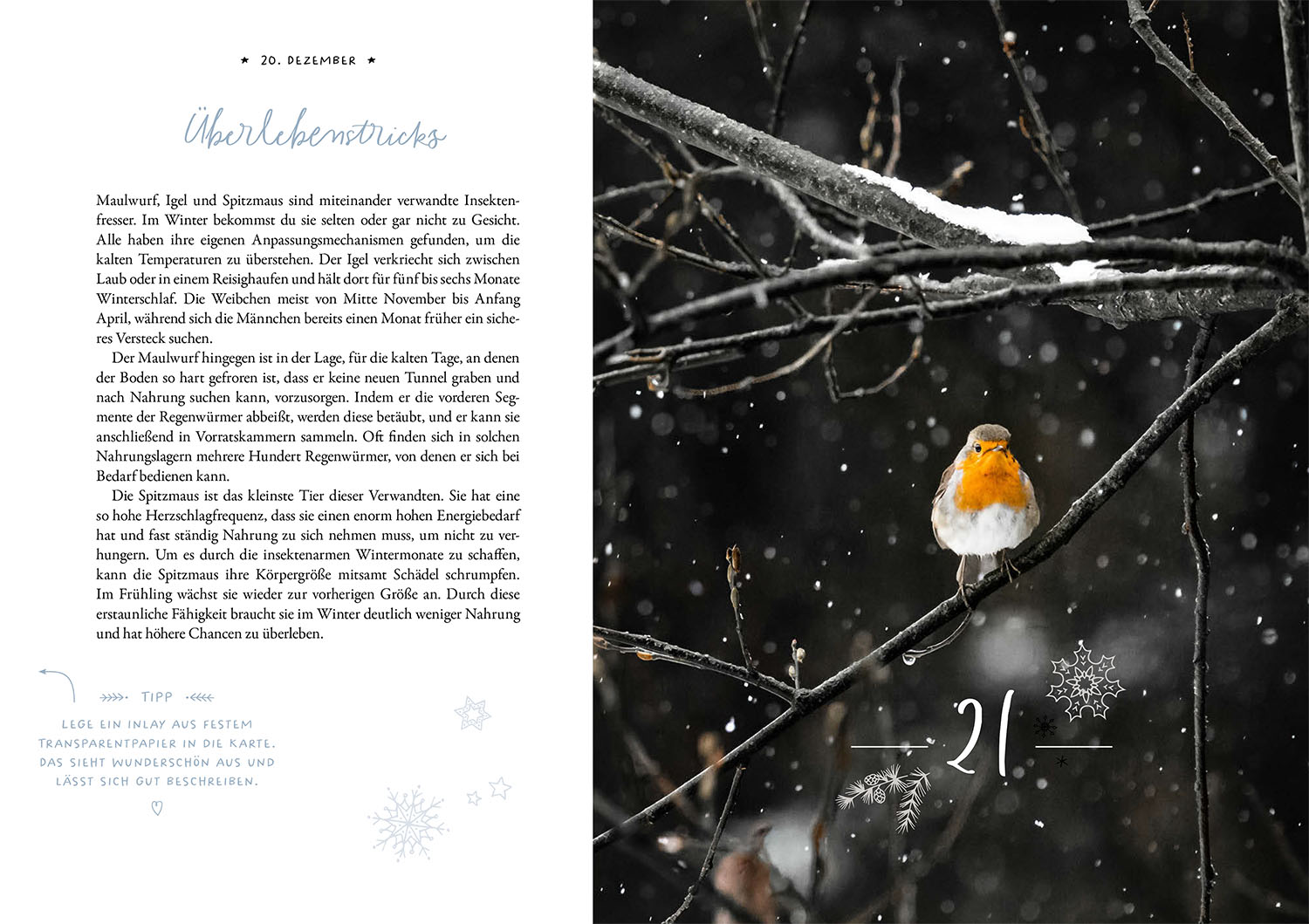 Tag für Tag lassen sich die „Türchen“ dieses Adventskalenders im Buchformat öffnen, hinter denen stimmungsvolle Wintertierfotos von Gamander López sowie DIY-Ideen und unterhaltsame Texte stehen. Das macht Lust auf eine kreative Weihnachtszeit – in ganz besonderer Verbindung zur Natur.