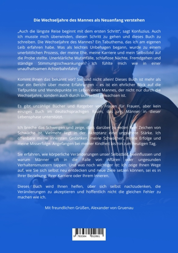 Über mich – Alexander von Gruenau Entdecke alles über Männergesundheit, Midlife-Crisis, Wechseljahre beim Mann, Beziehung, Fitness & mentale Stärke. Ehrlich, direkt & ohne Tabus! Autor von „Von Mann zu Mann – Die Wahrheit über Männer in der Midlife-Crisis“ Mein Name ist Alexander von Gruenau, ich bin Vater von vier Söhnen und aufgewachsen in der ehemaligen DDR. Mein Leben war von Anfang an eine wilde Achterbahnfahrt – zwischen Anpassung und Rebellion, Erfolg und Niederlage, Familie und Selbstsuche. In meinem Buch teile ich meine Geschichte mit dir – ungeschönt, ehrlich und direkt. Alles, was du darin liest, spiegelt meine eigenen Erlebnisse wider. Von meiner Kindheit hinter dem Eisernen Vorhang bis zu meinem heutigen Leben als Mann in der zweiten Lebenshälfte. Besonders die Wechseljahre waren für mich eine der härtesten Zeiten überhaupt. Körperlich, seelisch und auch in meinen Beziehungen kam ich an meine Grenzen – und manchmal weit darüber hinaus. Ursprünglich wollte ich mit dem Schreiben dieses Buches vor allem meine eigene Geschichte aufarbeiten. Ich wollte verstehen, warum ich heute so bin, wie ich bin. Dabei ist mir klar geworden: Meine Geschichte ist keine Ausnahme. Ganz im Gegenteil – verdammt viele Männer erleben genau das Gleiche. Sie sprechen nur nicht darüber. Genau das will ich ändern. Mit diesem Buch möchte ich dir helfen – egal ob du selbst mitten in der Midlife-Crisis steckst oder einfach verstehen willst, was mit deinem besten Kumpel, deinem Chef oder deinem Partner los ist. Ich wünsche mir, dass meine Geschichte dir Mut macht, dich selbst ehrlich anzuschauen. Denn wir Männer haben mehr drauf, als nur zu funktionieren – wir haben das Recht auf ein richtig gutes Leben. Gerade in der zweiten Halbzeit.