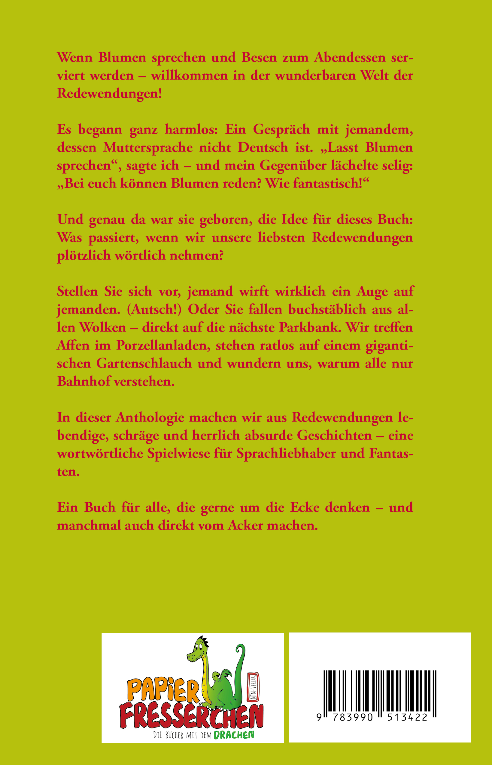 Es begann ganz harmlos: Ein Gespräch mit jemandem, dessen Muttersprache nicht Deutsch ist. „Lasst Blumen sprechen“, sagte ich – und mein Gegenüber lächelte selig: „Bei euch können Blumen reden? Wie fantastisch!“ Und genau da war sie geboren, die Idee für dieses Buch: Was passiert, wenn wir unsere liebsten Redewendungen plötzlich wörtlich nehmen?