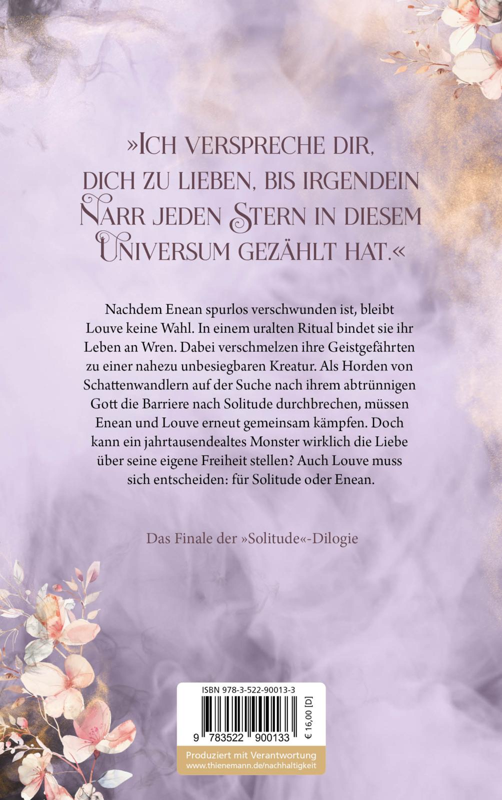 Nachdem Enean spurlos verschwunden ist, bleibt Louve keine Wahl. In einem uralten Ritual bindet sie ihr Leben an Wren. Dabei verschmelzen ihre Geistgefährten zu einer nahezu unbesiegbaren Kreatur. Als Horden von Schattenwandlern auf der Suche nach ihrem abtrünnigen Gott die Barriere nach Solitude durchbrechen, müssen Enean und Louve erneut gemeinsam kämpfen. Doch kann ein Jahrtausend altes Monster wirklich die Liebe über seine eigene Freiheit stellen? Auch Louve muss sich entscheiden: für Solitude oder Enean.