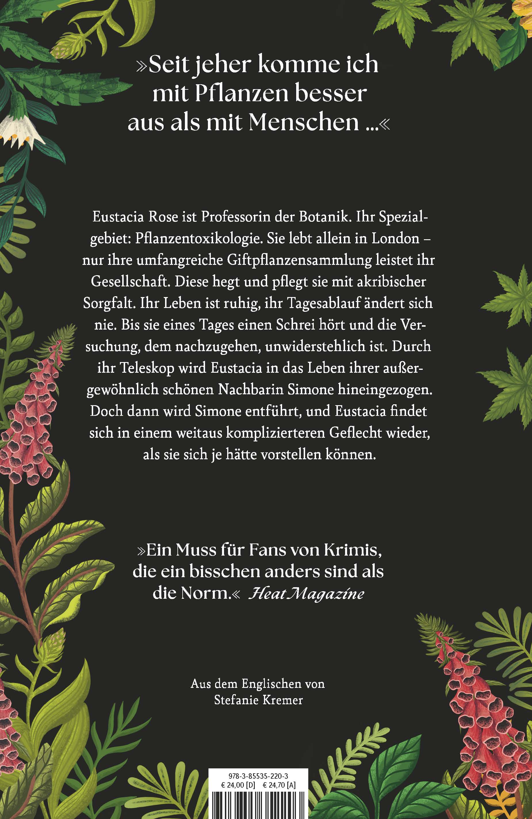 Eustacia Rose ist Professorin der Botanik. Ihr Spezialgebiet: Pflanzentoxikologie. Sie lebt allein in London - nur ihre umfangreiche Giftpflanzensammlung leistet ihr Gesellschaft. Diese hegt und pflegt sie mit akribischer Sorgfalt. Ihr Leben ist ruhig, ihr Tagesablauf ändert sich nie. Bis sie eines Tages einen Schrei hört und die Versuchung, dem nachzugehen, unwiderstehlich ist. Durch ihr Fernrohr wird Eustacia in das Leben ihrer außergewöhnlich schönen Nachbarin Simone hineingezogen. Doch dann wird Simone entführt, und Eustacia findet sich in einem weitaus komplizierteren Geflecht wieder, als sie sich je hätte vorstellen können.