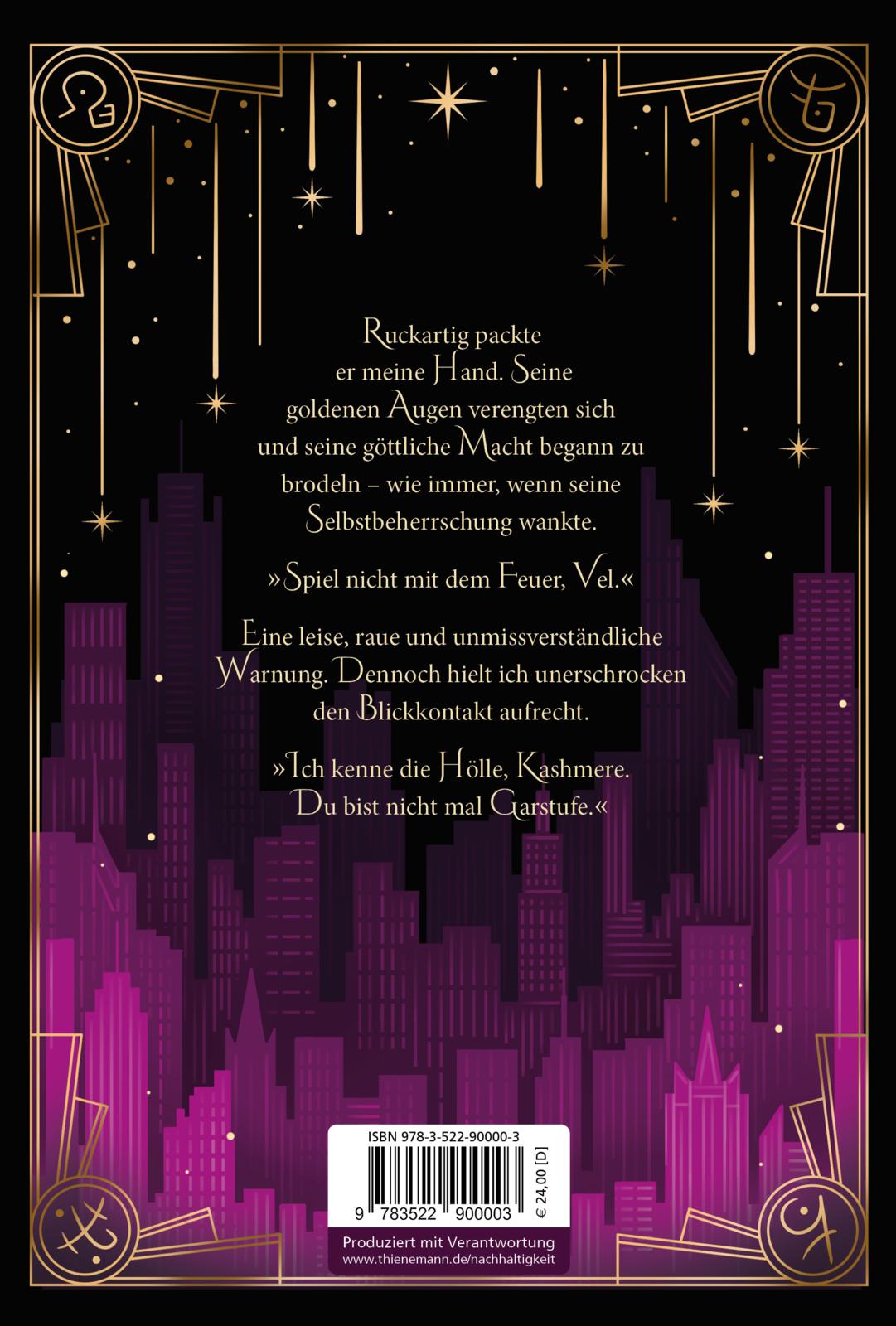 Als die Sterne fielen, kehrte die Magie in unsere Welt zurück und mit ihr neue Götter. Seit diesem Tag träumte Velvet von der Aufnahme in einen Hexenzirkel, aber Schicksal und Verrat zwangen ihr einen anderen Weg auf: den einer Dämonenreiterin. Doch dämonische Kräfte sind unberechenbar, und als sie Velvet eines Tages mit Visionen einer brennenden Zukunft fluten, entdeckt sie, dass ein magisches Virus die unsterblichen Götter auszulöschen droht. Um es aufzuhalten, soll sie das Blut der sieben göttlichen Söhne beschaffen. Ein schier unmögliches Unterfangen - würde Velvet nicht zufällig einen der Göttersöhne kennen: Kash, alias Kashmere Sinclair, alias ihr Ex und der Grund für all ihre zerstörten Träume. Ihn um Hilfe zu bitten, reißt nicht nur alte Wunden auf, sondern stürzt Velvet in einen erbitterten Kampf um ihr Herz und die Rettung der Welt.