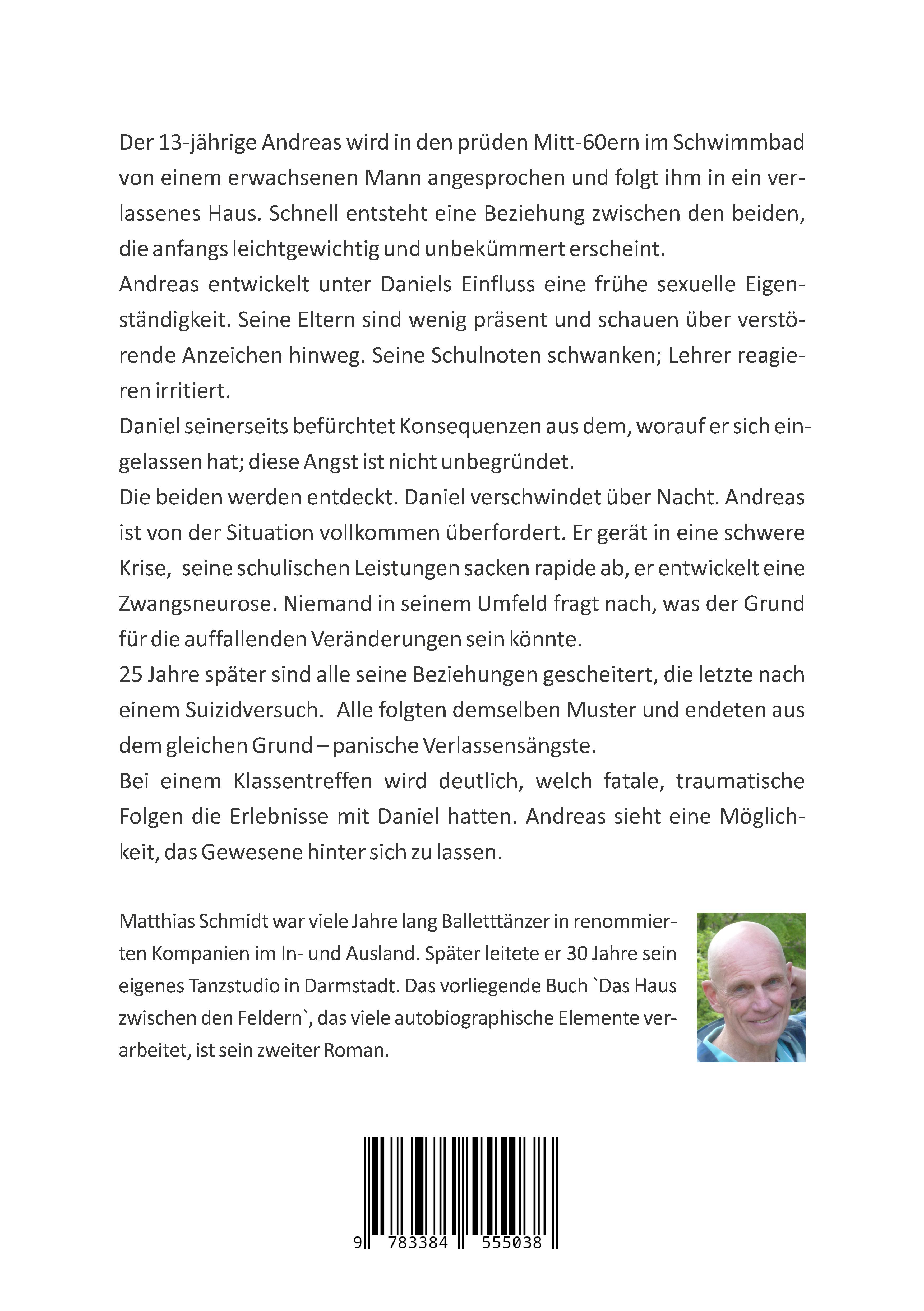 Matthias Schmidt war viele Jahre lang Balletttänzer in renommierten Kompanien im In- und Ausland. Später leitete er 30 Jahre sein eigenes Tanzstudio in Darmstadt. Das vorliegende Buch `Das Haus zwischen den Feldern`, das viele autobiographische Elemente verarbeitet, ist sein zweiter Roman.