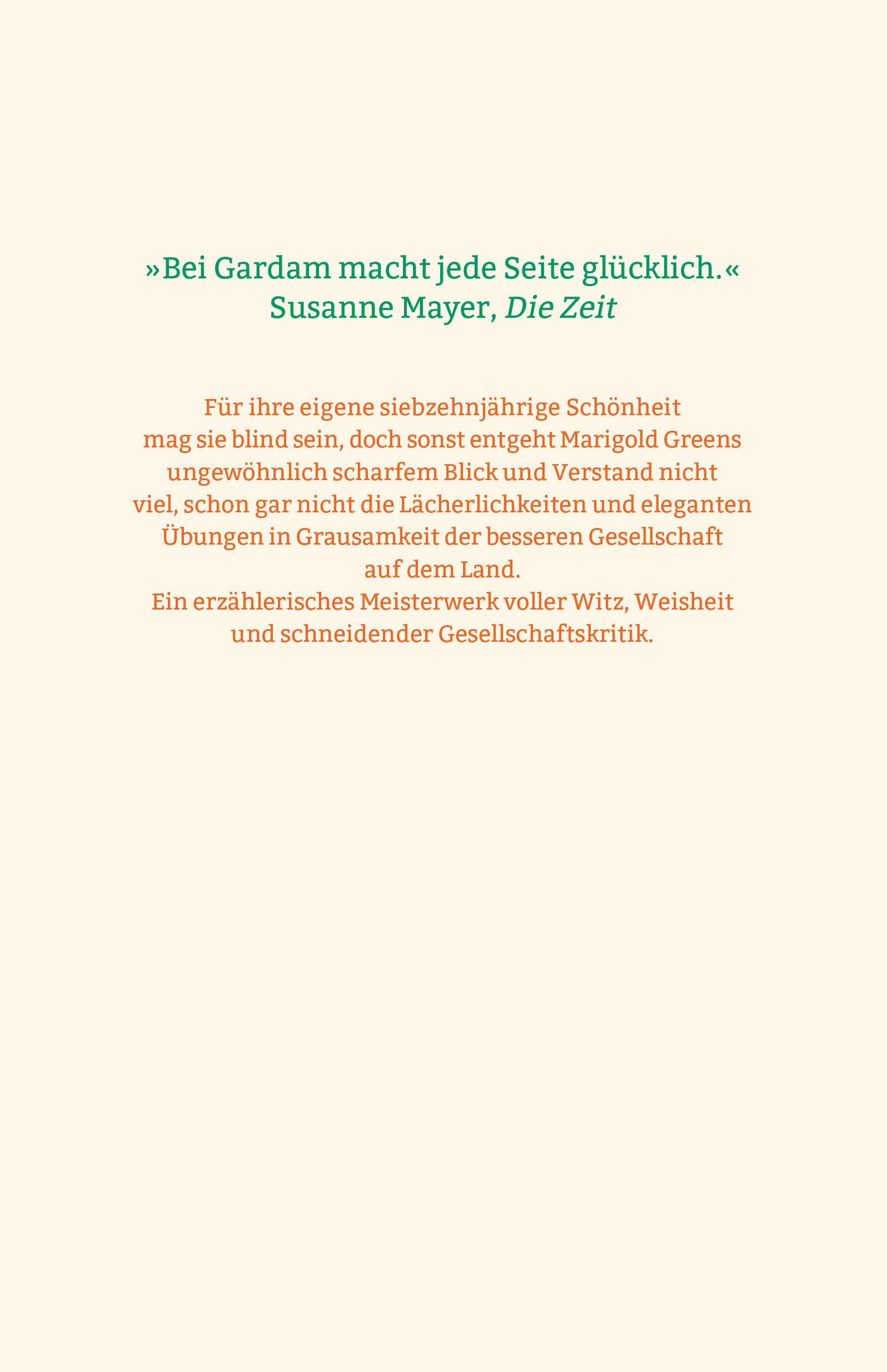 Man kann spannender aufwachsen als Marigold Green. Das Jungeninternat in Yorkshire, dem ihr Vater vorsteht, ist alles, was sie mit siebzehn von der Welt gesehen hat, richtige Freunde hat sie keine, und die Kommunikation mit ihrem Vater beschränkt sich auf schweigsame abendliche Schachpartien. Grell sind hier nur ihre leuchtend orangeroten Locken, ihre übersteigerte Fantasie und ihr vollkommen unangepasstes Auftreten. Da kehrt aus dem Nichts ihre einzige Kindheitsfreundin Grace zurück, von der sie jahrelang nichts gehört hat, umwerfend schön, nonchalant und rätselhaft, und plötzlich ist nichts mehr, wie es war … Mit ihrem ganz besonderen Humor erzählt Jane Gardam von den Grausamkeiten der Adoleszenz und der verblüffenden Allgegenwart des Eros in der bigotten nachviktorianischen Gesellschaft.