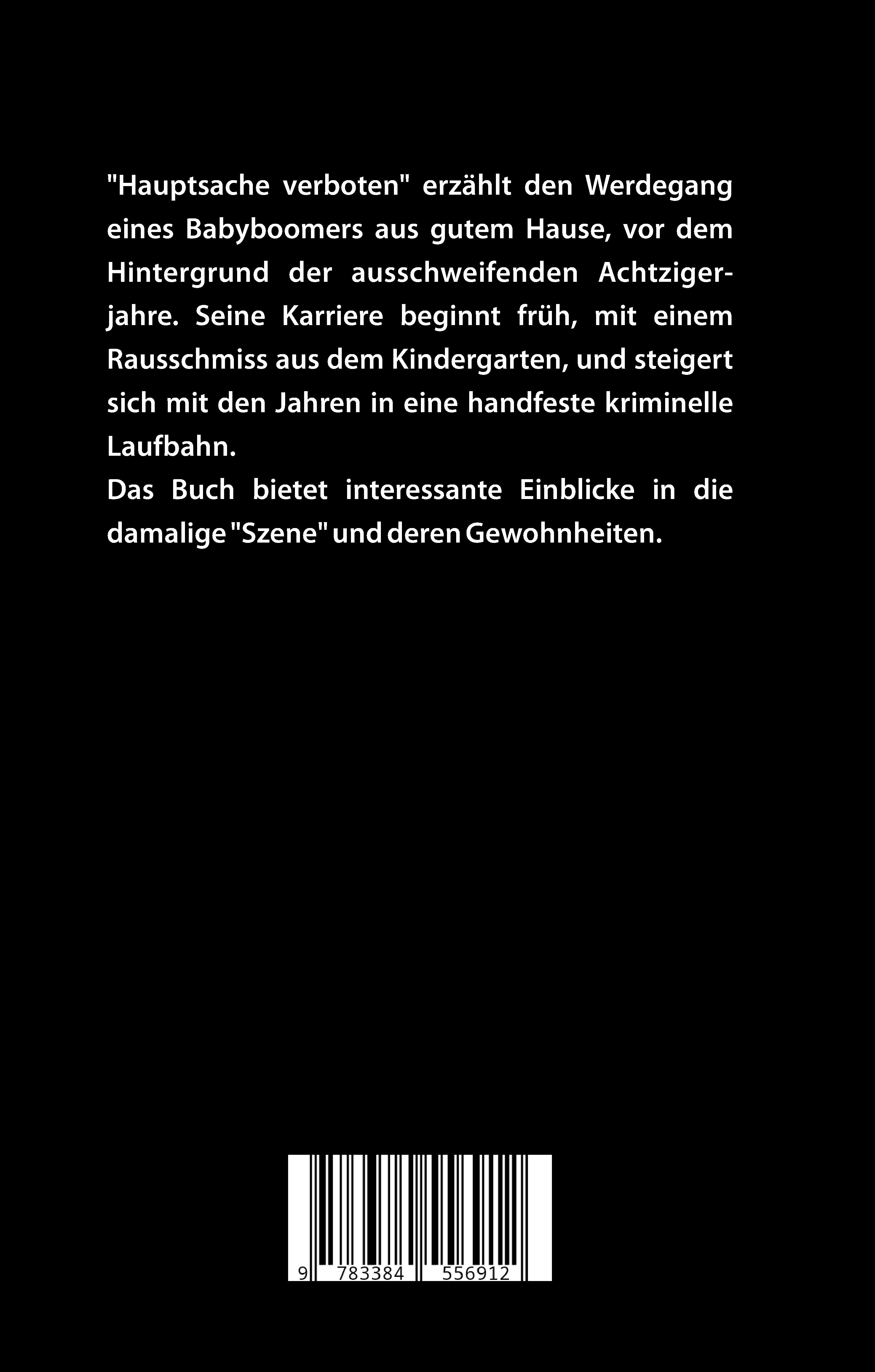 "Hauptsache verboten" erzählt den Werdegang eines Babyboomers aus gutem Hause, vor dem Hintergrund der ausschweifenden Achtzigerjahre. Seine Karriere beginnt früh, mit einem Rausschmiss aus dem Kindergarten, und steigert sich mit den Jahren in eine handfeste kriminelle Laufbahn.Das Buch bietet interessante Einblicke in die damalige "Szene" und deren Gewohnheiten.