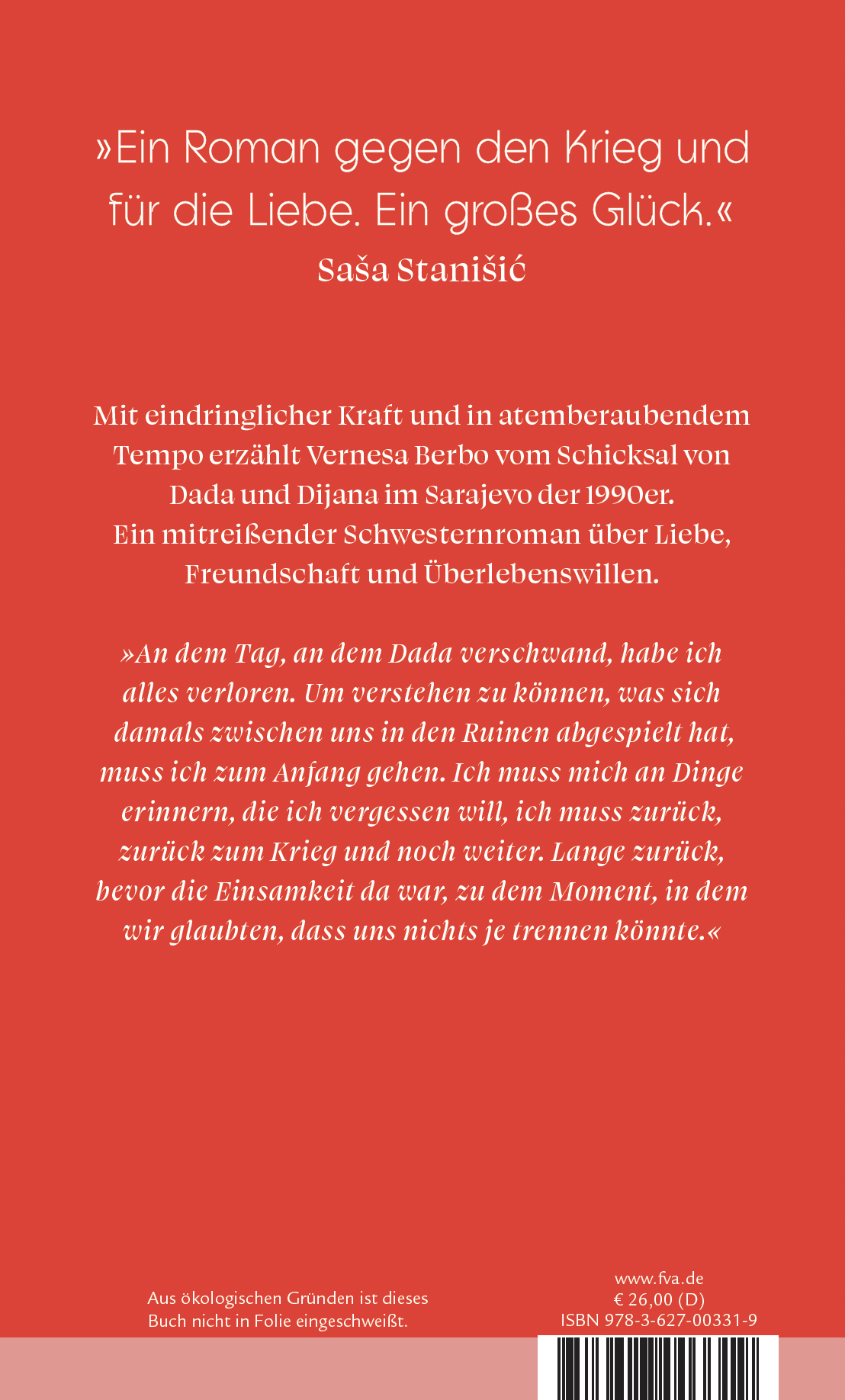 So zärtlich, dennoch kompromisslos und zugleich voller erzählerischer Kraft ist selten über den Krieg und die Liebe entgegen allen Widrigkeiten geschrieben worden. Vernesa Berbo ist selbst Überlebende der Belagerung Sarajevos und stößt uns mitten hinein in jene Realität des Krieges, die noch immer zu wenig Beachtung findet: das Schicksal der Frauen, ihre tiefe seelische Verwundung, aber auch ihre große innere Stärke. Ein mitreißender Roman von atemloser Spannung.