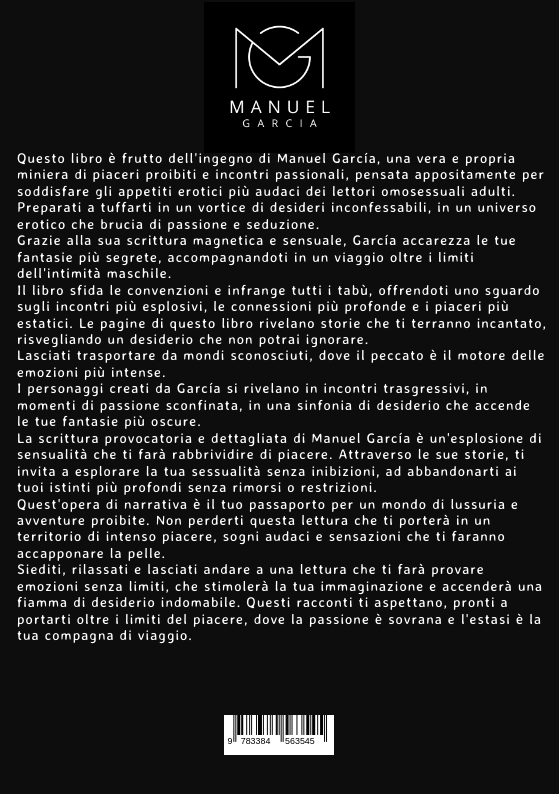 Manuel García è un autore audace e provocatorio nel panorama letterario erotico gay. Nato in una piccola città costiera, ha sempre avuto una forte passione per la scrittura e una vivida immaginazione che lo ha spinto a esplorare gli angoli più oscuri dell'intimità maschile. Fin da giovane, Manuel ha sentito la chiamata a liberarsi dalle catene delle convenzioni sociali, a sfidare i tabù e a dare voce ai desideri inconfessabili degli uomini gay. Attraverso la sua scrittura sensuale e coinvolgente, ha creato un mondo letterario unico in cui erotismo e piacere si intrecciano con il desiderio di libertà e di esplorazione personale. Il suo lavoro porta i lettori oltre i limiti della normalità, immergendoli in un universo intenso e provocatorio dove le barriere vengono abbattute e i desideri più nascosti possono finalmente emergere. Manuel cerca di coinvolgere emotivamente i suoi lettori, di farli risuonare con le sue parole e di creare un legame profondo attraverso le pagine dei suoi libri. Con il suo stile incisivo e la capacità di catturare l'essenza dei momenti erotici, Manuel García è diventato una voce di spicco nel genere dell'erotismo gay. Che si tratti di racconti o di romanzi, le sue opere sono amate da un vasto pubblico di uomini gay adulti che cercano una lettura che vada oltre il semplice intrattenimento, stimolandoli intellettualmente e coinvolgendoli emotivamente. Manuel si è guadagnato una reputazione per la sua onestà e audacia nel trattare argomenti tabù, sempre con rispetto e sensibilità verso i suoi personaggi. I suoi scritti sono un invito a esplorare il mondo dell'erotismo, a liberare la propria sessualità e ad abbracciare pienamente i piaceri della vita. Oltre a essere un autore di successo, Manuel García è anche un sostenitore dei diritti LGBT+, promuovendo attivamente l'accettazione e la diversità attraverso la sua arte. Il suo obiettivo è aprire le menti, sfidare i pregiudizi e creare un mondo in cui l'amore e il desiderio siano liberi da discriminazioni e restrizioni. Con il suo talento innato e la sua passione per la scrittura erotica gay, Manuel García continua a influenzare il genere letterario, ispirando e intrattenendo i lettori di tutto il mondo con le sue storie accattivanti, sensuali e indimenticabili.