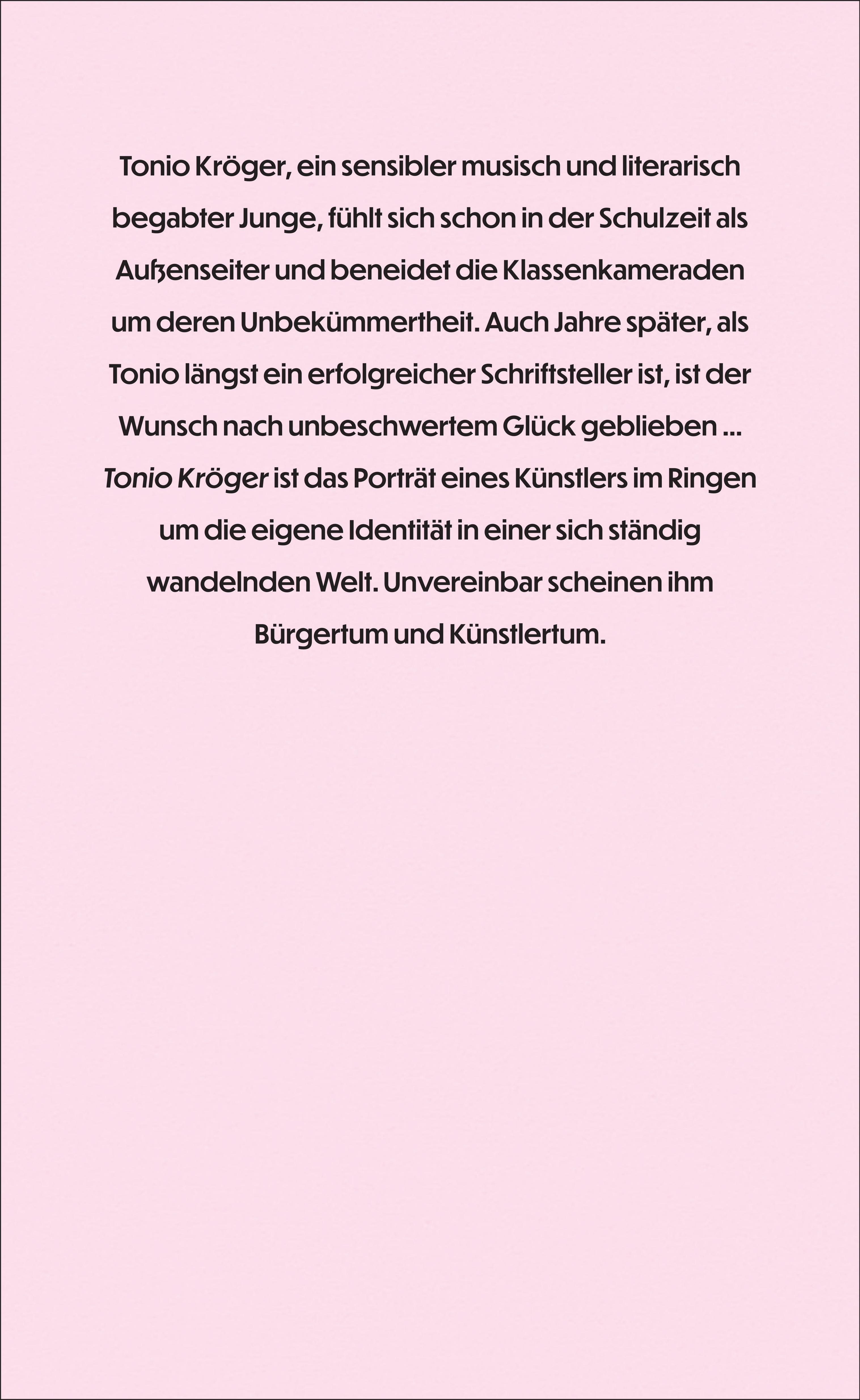 Tonio Kröger ist das Porträt eines Künstlers im Ringen um die eigene Identität in einer sich ständig wandelnden Welt. Unvereinbar scheinen ihm Bürgertum und Künstlertum; er ist zerrissen zwischen der Ablehnung der Enge des bürgerlichen Lebens und seiner Sehnsucht nach diesem einfachen Glück. Thomas Manns 1903 erschienene Novelle trägt autobiografische Züge.