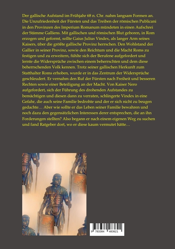 Der gallische Aufstand im Frühjahr 68 n. Chr. nahm langsam Formen an. Die Unzufriedenheit der Fürsten und das Treiben der römischen Publicani in den Provinzen des Imperium Romanum mündeten in einen Aufschrei der Stämme Galliens. Mit gallischen und römischen Blut geboren, in Rom erzogen und geformt, sollte Gaius Julius Vindex, als langer Arm seines Kaisers, über die größte gallische Provinz herrschen. Den Wohlstand der Gallier in seiner Provinz, sowie den Reichtum und die Macht Roms zu festigen und zu erweitern, fühlte sich der Berufene aufgefordert und lernte die Widersprüche zwischen einem beherrschten und dem diese beherrschenden Volk kennen. Trotz seiner gallischen Herkunft zum Statthalter Roms erhoben, wurde er in das Zentrum der Widersprüche geschleudert. Er vernahm den Ruf der Fürsten nach Freiheit und besseren Rechten sowie einer Beteiligung an der Macht. Von Kaiser Nero aufgefordert, sich der Führung des drohenden Aufstandes zu bemächtigen und diesen dann zu verraten, schlingerte Vindex in eine Gefahr, die auch seine Familie bedrohte und der er sich nicht zu beugen gedachte... Aber wie sollte er das Leben seiner Familie bewahren und noch dazu den gegensätzlichen Interessen derer entsprechen, die an ihn Forderungen stellten? Also begann er nach einem eigenen Weg zu suchen und fand Ratgeber dort, wo er diese kaum vermutet hätte...Vindex Vorstellungen einer glorreichen Zukunft wurden nicht vom Glanz Roms geblendet, sondern ergaben sich aus seiner eigenen Lage. Als Statthalter in Gallien sah er sich zumeist nur von Feinden umringt und mit Forderungen bedroht, gleich ob es sich dabei um römische Publicani, gallische Fürsten oder seinen Kaiser handelte... Sein heftigster Gegner war gallischer Fürst und römischer Präfekt zugleich. Castius Delvaux strebte ein Imperium Gallicum an! Was diesem Fürst vorschwebte, wurde auch für Vindex eine Verlockung! Gelang ihm dieser Weg, wich jede Art einer Bedrohung von seiner Familie. Auf klugem Rat aufbauend und dem Einfluss des Hermunduren Gerwin vertrauend, begann er die Belagerung der Stadt Lugdunum. Mittels dieses Fanals beabsichtigte er Roms Legionen vom Rhenus nach Gallien zu locken. Mit dem Wissen um die Sicherheit seiner Familie fielen seine letzten Hemmungen. Den derzeitigen Kaiser Roms und die Publicani in Gallien zu vernichten, vereinte er die Fürsten sowie Stämme der Gallier und begann mit einer Herausforderung Neros. Vindex begab sich auf seinen leuchtenden Pfad zur Macht. Mit Listen, Täuschungen und Versprechungen lenkte er die Belagerung Lugdunums und verstand den Aufstand zu verzögern. Wollte er die gallischen Fürsten nicht gänzlich verlieren, musste der Sturm auf Lugdunum bald folgen... Würde ein solcher Angriff gelingen? Eine Entscheidung bahnte sich an, bevor sich unerwartete Hindernisse auftürmten. Was bezweckten die Fürsten Galliens? Warum stellte sich sein größter gallischer Feind plötzlich an seine Seite? Wo blieben die Legionen vom Rhenus? Vindex, noch im Ungewissen verharrend, erlebte das heftige Aufbegehren seines eigenen Sohnes und auch der Hermundure verschloss sich seinem Willen. Würde dies seine Absichten ins Wanken bringen...