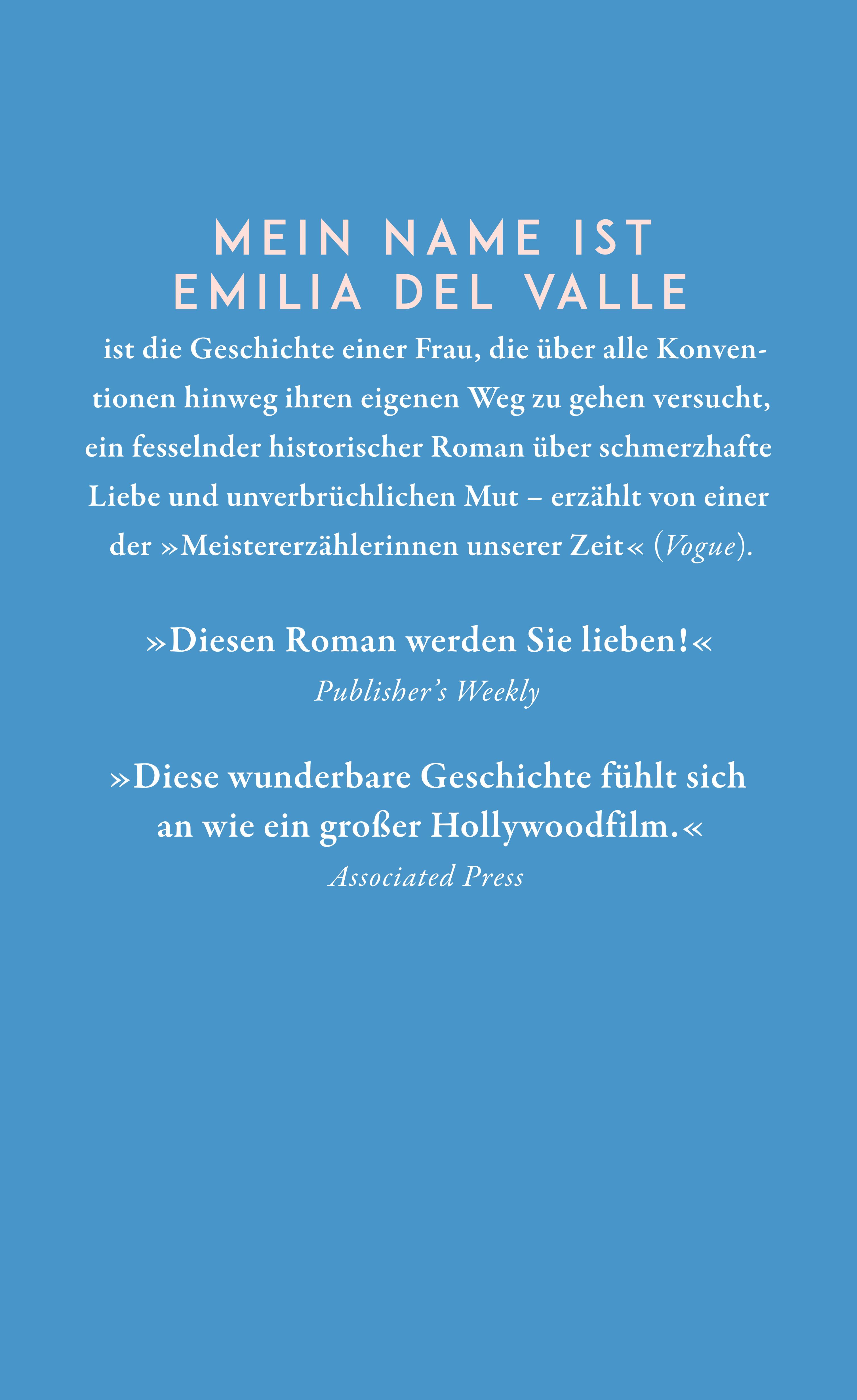 »Mein Name ist Emilia del Valle ist die Geschichte einer Frau, die über alle Konventionen hinweg ihren eigenen Weg zu gehen versucht, ein fesselnder historischer Roman über schmerzhafte Liebe und unverbrüchlichen Mut - erzählt von einer der ›Meistererzählerinnen unserer Zeit‹« – Vogue