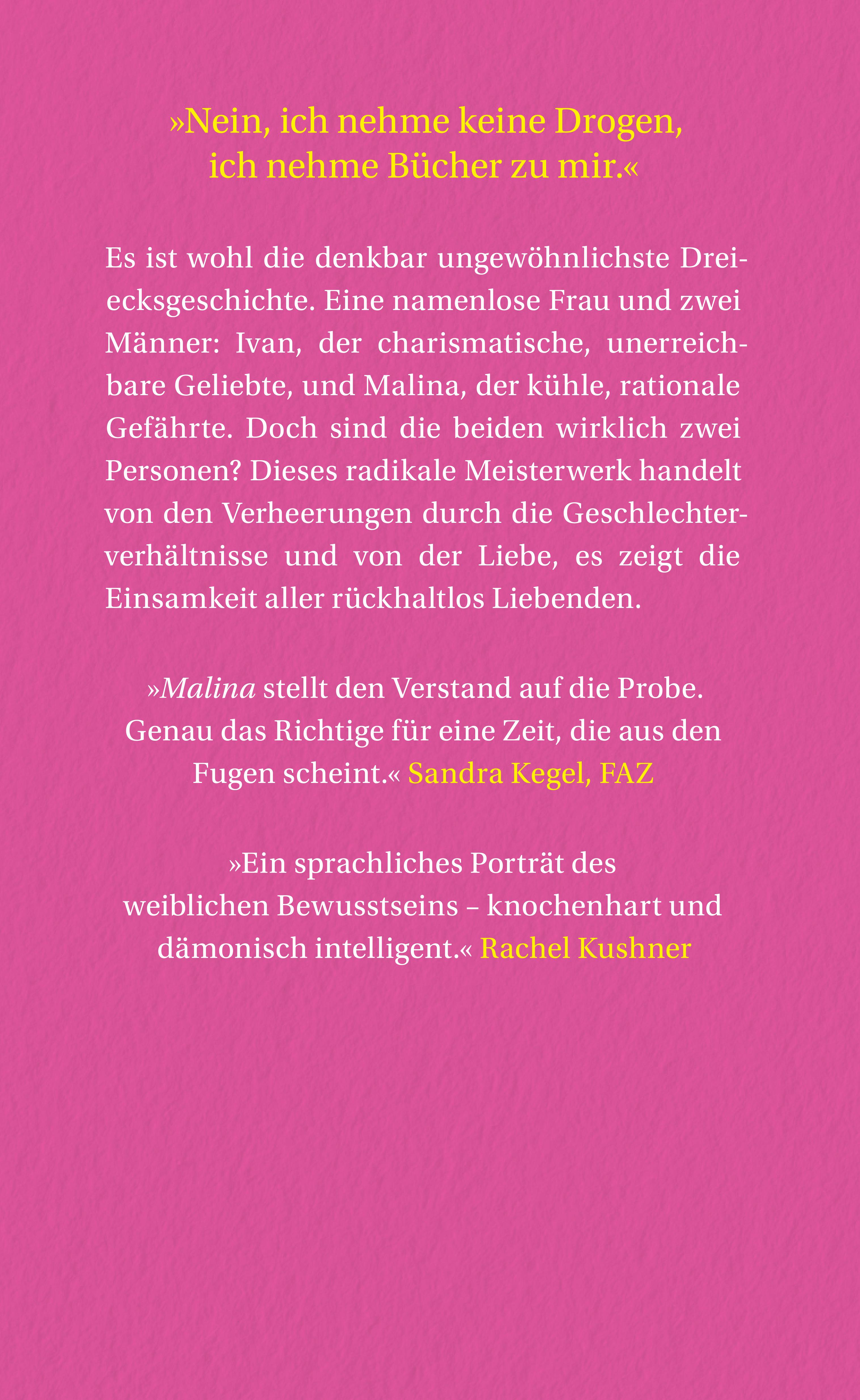 Ingeborg Bachmann, geboren am 25. Juni 1926 in Klagenfurt, wurde durch einen Auftritt vor der Gruppe 47 als Lyrikerin bekannt. Nach den Gedichtbänden Die gestundete Zeit (1953) und Anrufung des Großen Bären (1956) publizierte sie Hörspiele, Essays und zwei Erzählungsbände. Malina (1971) ist ihr einziger vollendeter Roman. Bachmann starb am 17. Oktober 1973 in Rom.