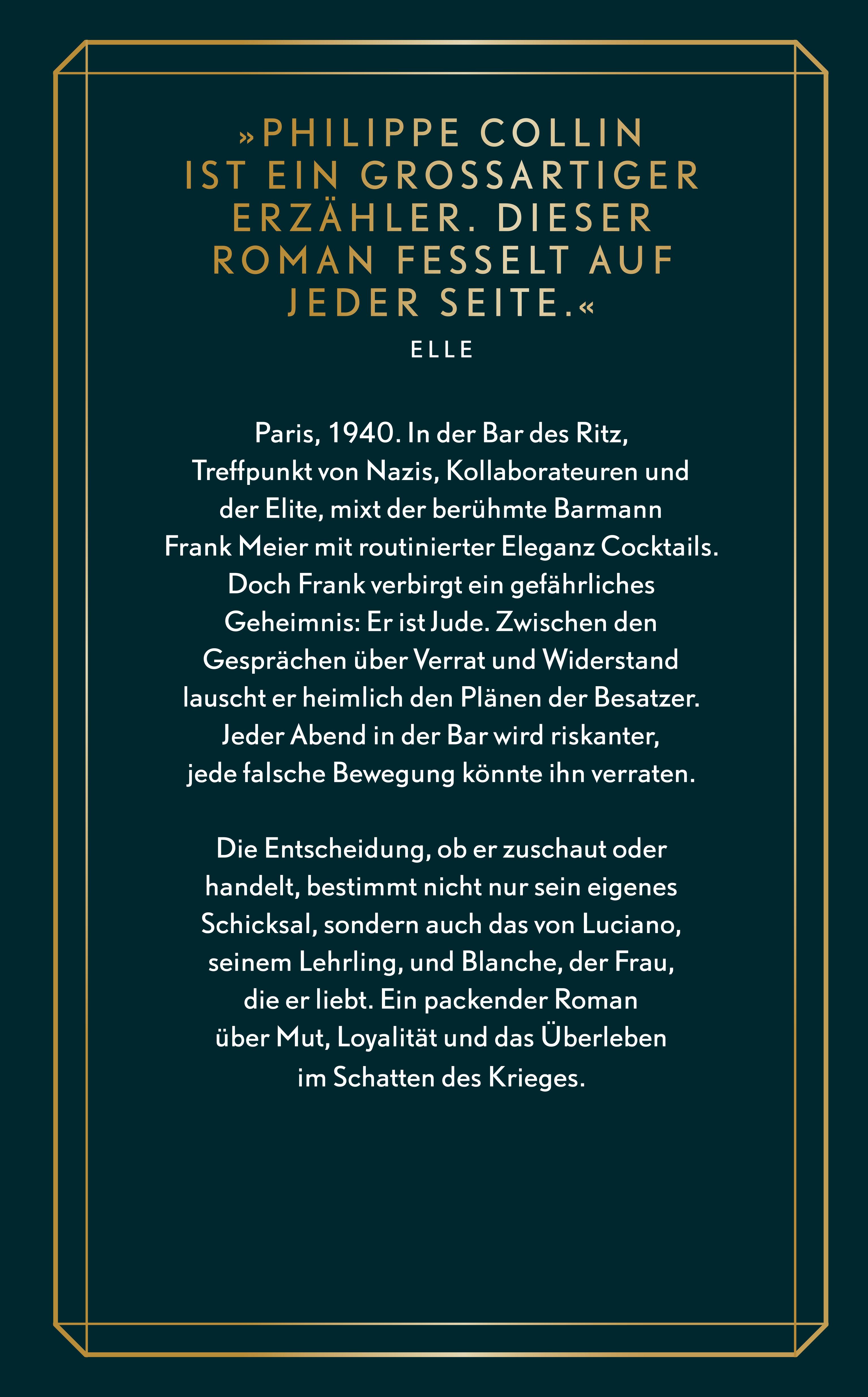 Paris, 1940. In der Bar des legendären Hotel Ritz scheint warmes Licht auf die polierte Messingtheke, während Nazis, Kollaborateure und Mitglieder der französischen Elite ihre Cocktails schlürfen - weit entfernt vom Lärm des Krieges. Frank Meier, der berühmte Barmann des Ritz, serviert sie mit routinierter Eleganz. Doch hinter seinem höflichen Lächeln verbirgt sich die Angst. Jeder Drink, den er mixt, könnte sein letzter sein. Denn er hat ein Geheimnis, das ihn das Leben kosten könnte: Er ist Jude.