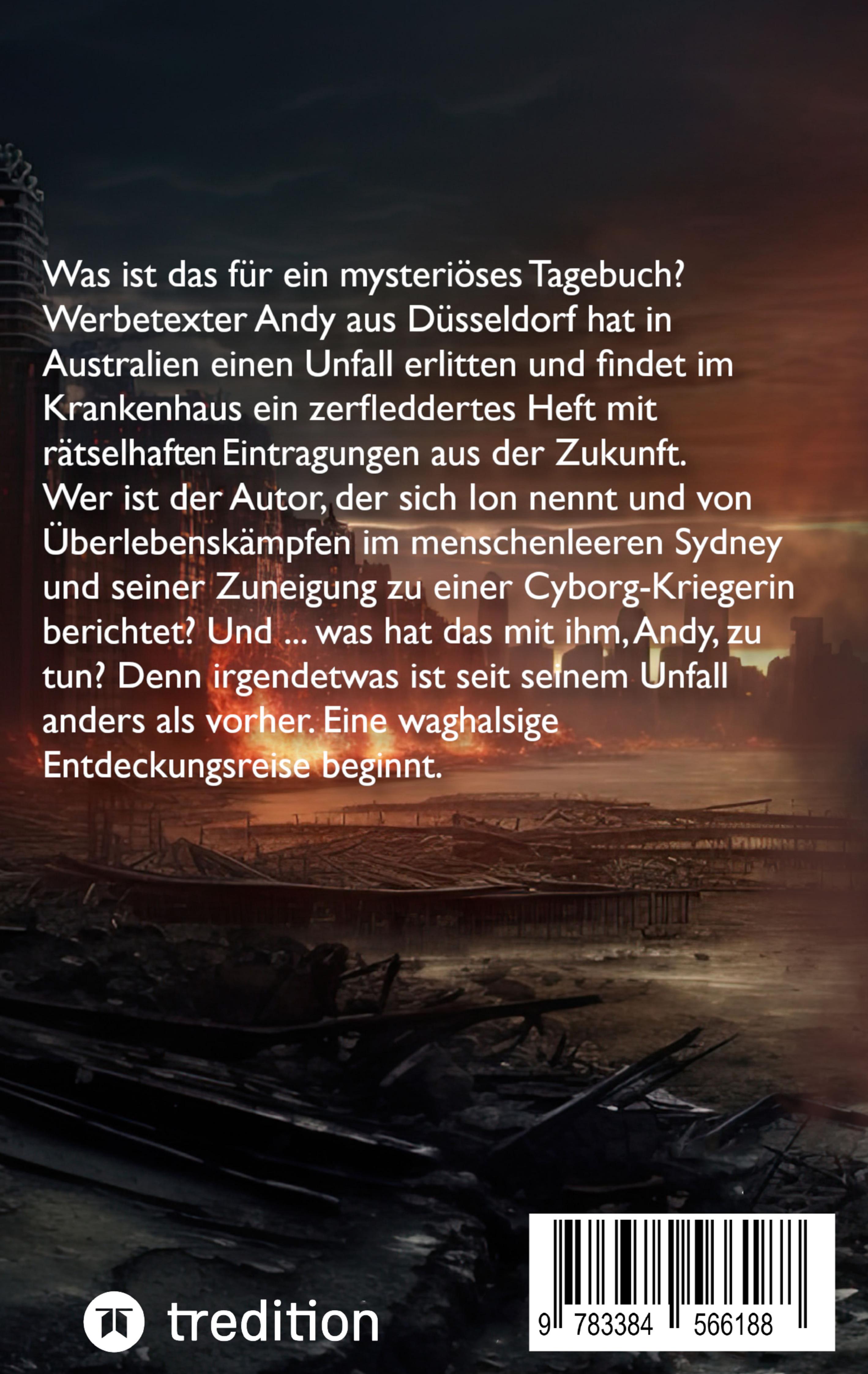 Was ist das für ein mysteriöses Tagebuch? Werbetexter Andy aus Düsseldorf hat in Australien einen Unfall erlitten und findet im Krankenhaus ein zerfleddertes Heft mit rätselhaften Eintragungen aus der Zukunft. Wer ist der Autor, der sich Ion nennt und von Überlebenskämpfen im menschenleeren Sydney und seiner Zuneigung zu einer Cyborg-Kriegerin berichtet? Und ... was hat das mit ihm, Andy, zu tun? Denn irgendetwas ist seit seinem Unfall anders als vorher. Eine waghalsige Entdeckungsreise beginnt.
