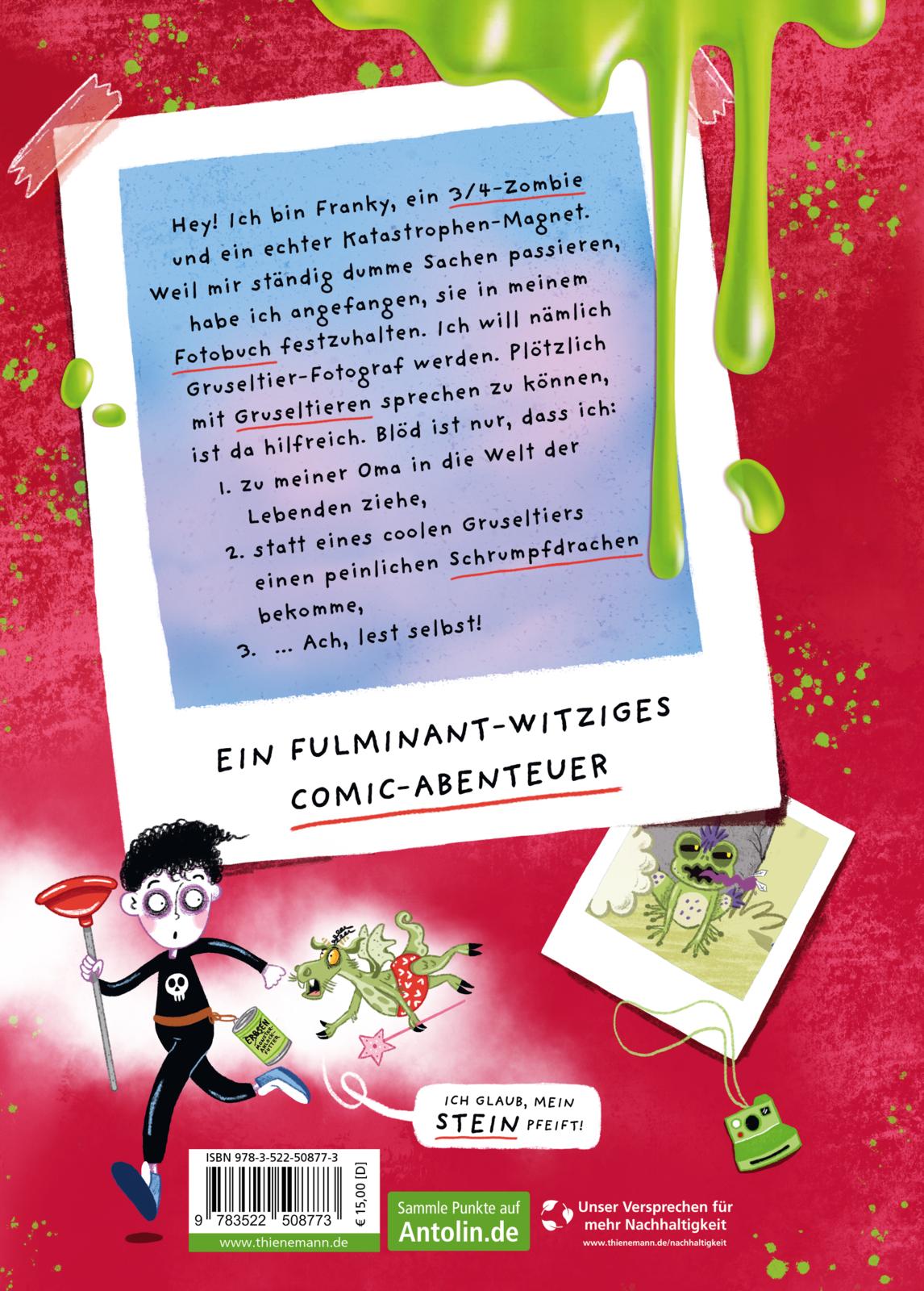 Franky ist ein echter Katastrophen-Magnet. Ständig passieren ihm die unglaublichsten Dinge, sodass er beschlossen hat, alles in einem Fotobuch festzuhalten. Dass Franky ein 3/4-Zombie ist, macht alles nicht einfacher, denn "anders sein" ist manchmal ziemlich anstrengend. Trotzdem ist sein erklärtes Ziel, ein berühmter Gruseltier-Fotograf zu werden. Gut, dass Franky mit Gruseltieren sprechen kann. Allerdings bekommt er Odi an die Seite gestellt - einen Schrumpfdrachen, der statt Feuer nur ekligen Schleim spuckt ... Wenig hilfreich, wenn man auf der Suche nach dem eigenen coolen Gruseltier ist.