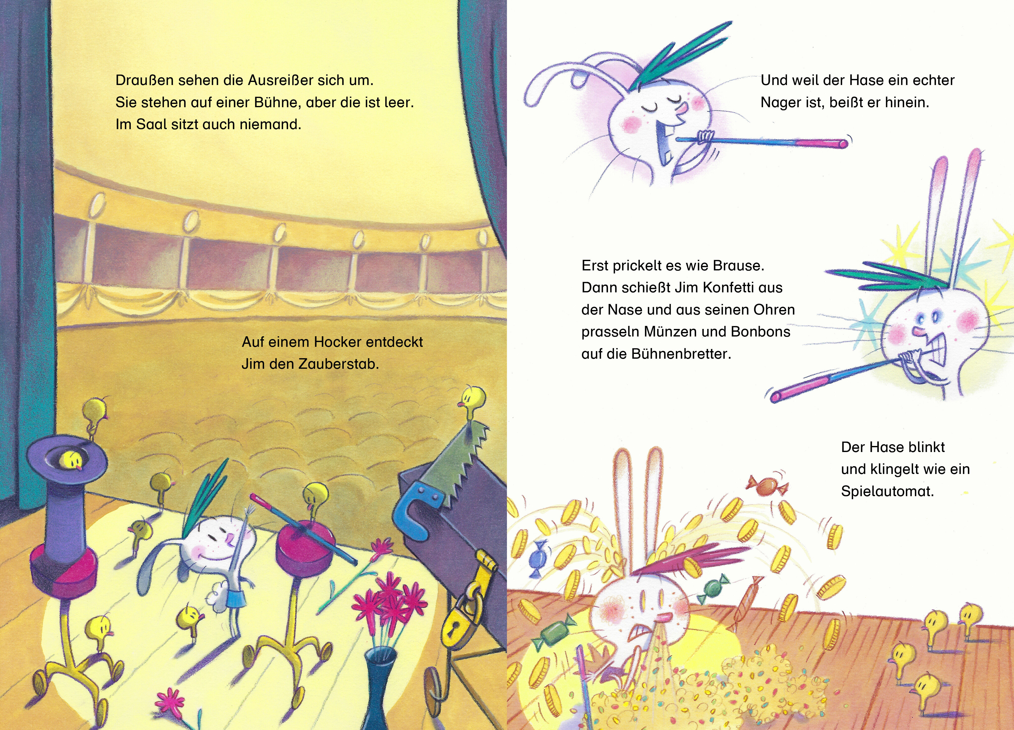 Simsalabim, der Hase Jim! Im schwarzen Hut des berühmten Zauberers Mogel-Strauß warten die Tiere auf ihren großen Auftritt. Auch der Hase Jim Salabim. Doch warum ist es so schrecklich eng in diesem Hut? Jim beschließt auszubüxen. Im Schlepptau hat er eine Horde Küken, die auch mal an die frische Luft wollen. Klar, dass der Zauberer das gar nicht lustig findet. Er jagt ihnen nach. Wie gut, dass seine Gehilfen, die Tauben Pick und Nick, nicht ganz so clever sind und Jim ein Stück vom Zauberstab abgeknabbert hat ... Ein lustig-turbulentes Abenteuer zum Vor- und Selberlesen ab 5 Jahren