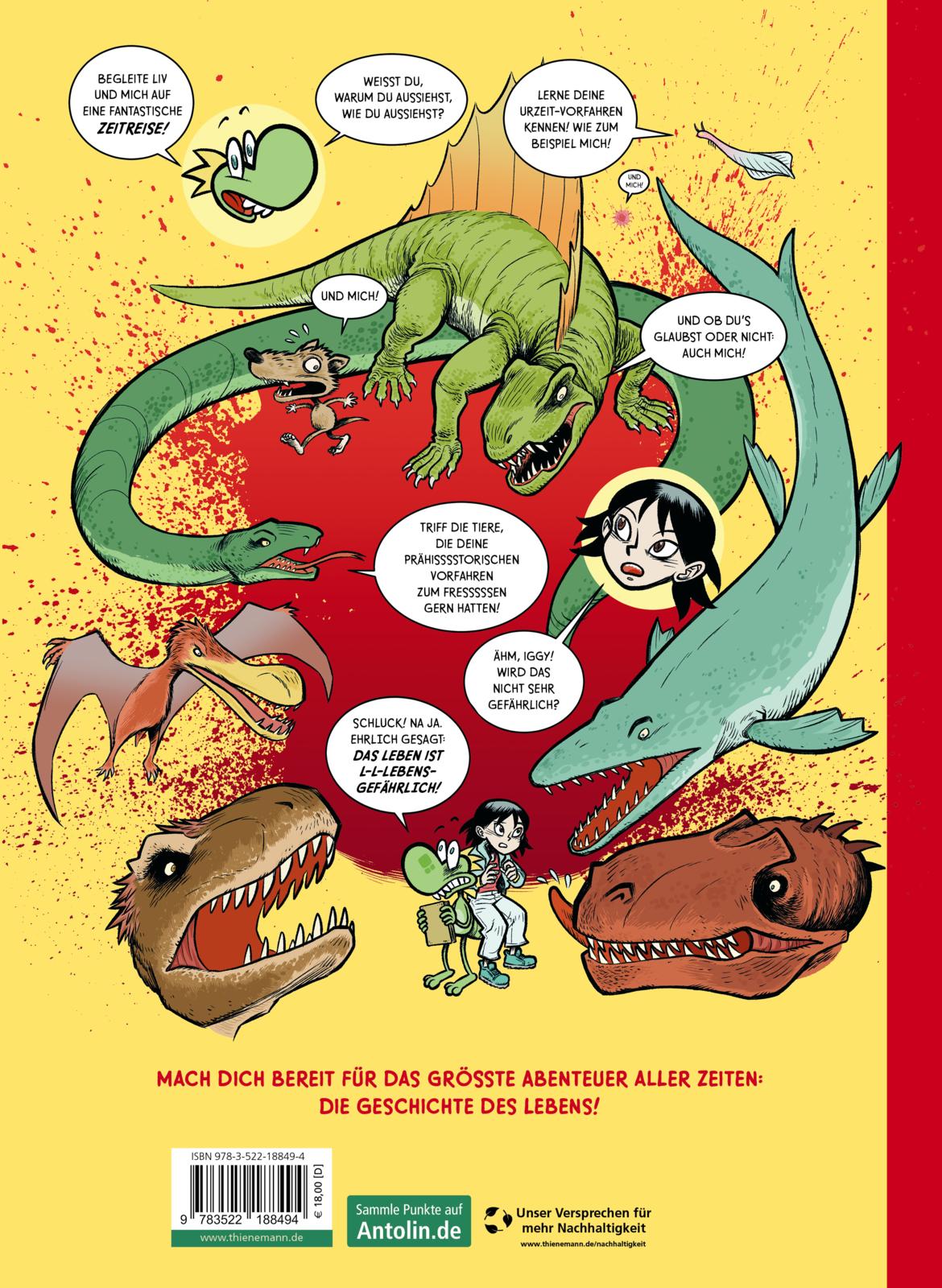 Diese großformatige Graphic Novel nimmt junge Leser mit auf eine faszinierende Zeitreise durch die Geschichte des Lebens. Liv und Iggy sind ein sympathisches und ungewöhnliches Expeditions-Team, das die Geheimnisse der Evolution aufdeckt. Sie begegnen nicht nur Dinosauriern, gigantischen Insekten und Meeresungeheuern, sondern entdecken zugleich die erstaunliche Entwicklung des Menschen: von winzigen Einzellern bis zum heutigen Menschen. Humorvoll und anschaulich erzählt, mit einer großen Portion Abenteuer, vermittelt das Buch naturwissenschaftliches Wissen auf eine Weise, die staunen lässt.