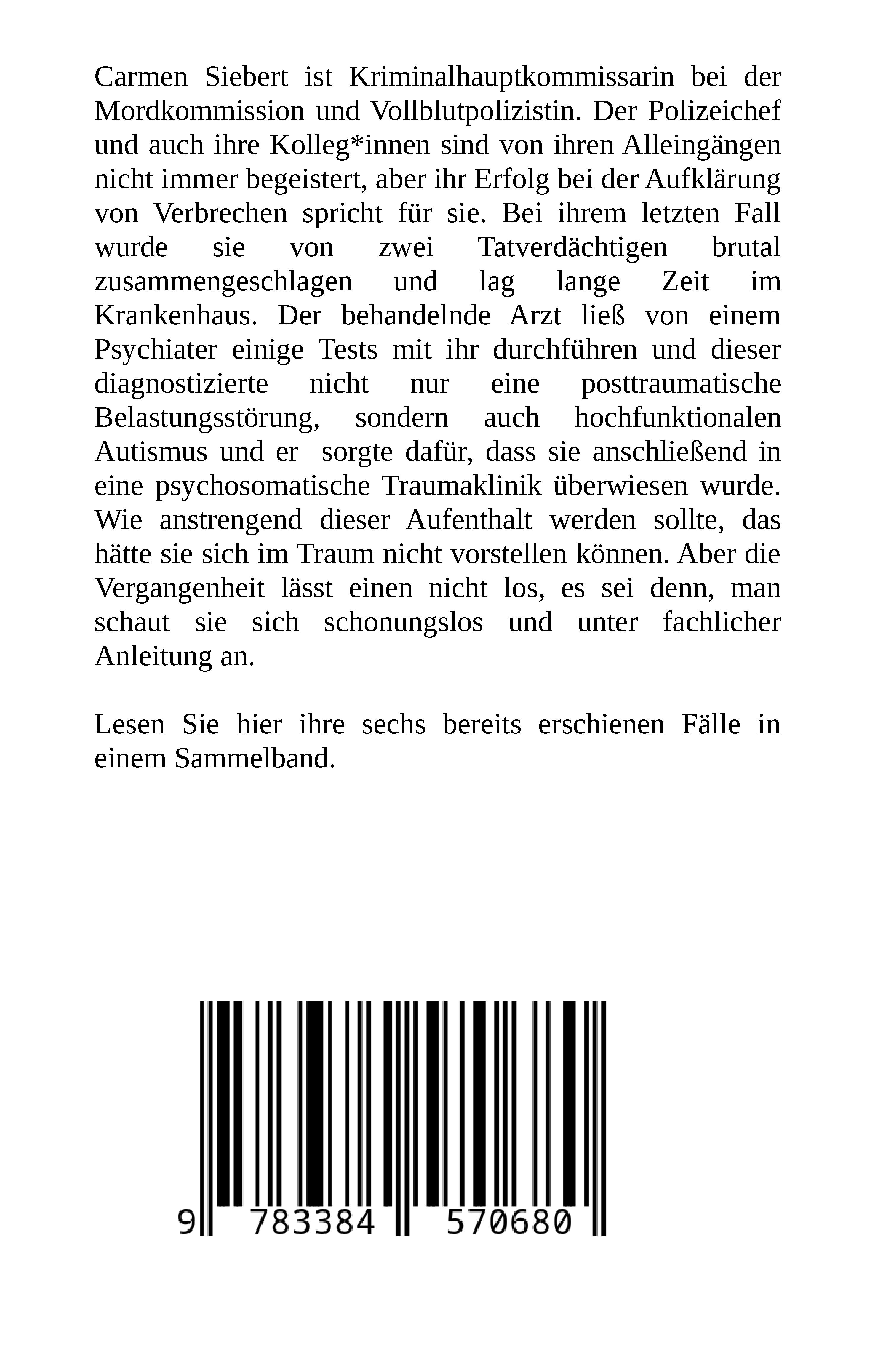 Dieses Buch enthält die ersten sechs bereits erschienenen Fälle der autistischen Kriminalhauptkommissarin Carmen Siebert. Ihre Autistischen Fähigkeiten verhelfen ihr immer wieder zu einer anderen Sicht auf die Fälle - und zu einer sehr eigenen Umgangsweise - als es neurotypischen Menschen überhaupt möglich ist.AutistInnen sind nicht behindert - Autismus ist genetisch bedingt und wird vererbt - sondern werden behindert.