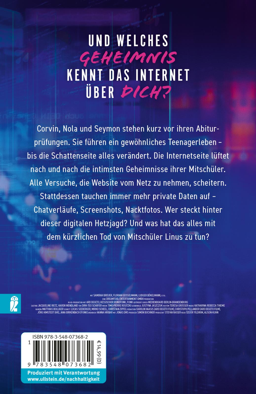 Corvin, Nola und Seymon stehen kurz vor ihren Abiturprüfungen. Sie führen ein gewöhnliches Teenagerleben - bis die Schattenseite alles verändert. Die Internetseite lüftet nach und nach intimste Geheimnisse ihrer Mitschüler:innen. Alle Versuche, die Seite aus dem Netz zu nehmen, scheitern. Stattdessen tauchen immer mehr private Daten auf - Chatverläufe, Screenshots, Nacktfotos. Wer steckt hinter der Schattenseite? Und was hat das alles mit dem Tod von Mitschüler Linus zu tun?