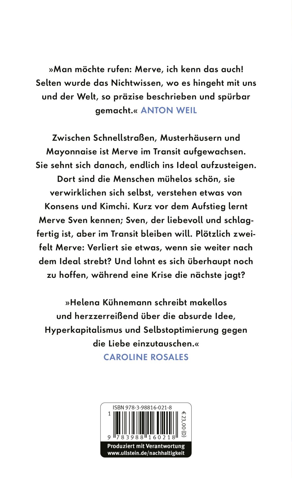 Merve ist im Transit aufgewachsen, zwischen Schnellstraßen, Musterhäusern und Plastikpflanzen. Hier, wo die Zeit stehen geblieben scheint, betrinkt sich ihr Großvater zu Schlagermusik und wappnet ihr Vater sich für den Weltuntergang. Merve will nur weg; sie sehnt sich danach, endlich ins Ideal aufzusteigen. Dort sind die Menschen mühelos schön, sie verwirklichen sich selbst, verstehen etwas von Konsens und Kimchi. Sie haben statt Routinen ihren Rhythmus gefunden. Das Versprechen: Wer hart genug an sich arbeitet, kann etwas Besonderes sein. Im Ideal hofft Merve auch, ihre Mutter wiederzufinden, die verschwunden ist, als sie ein kleines Kind war.