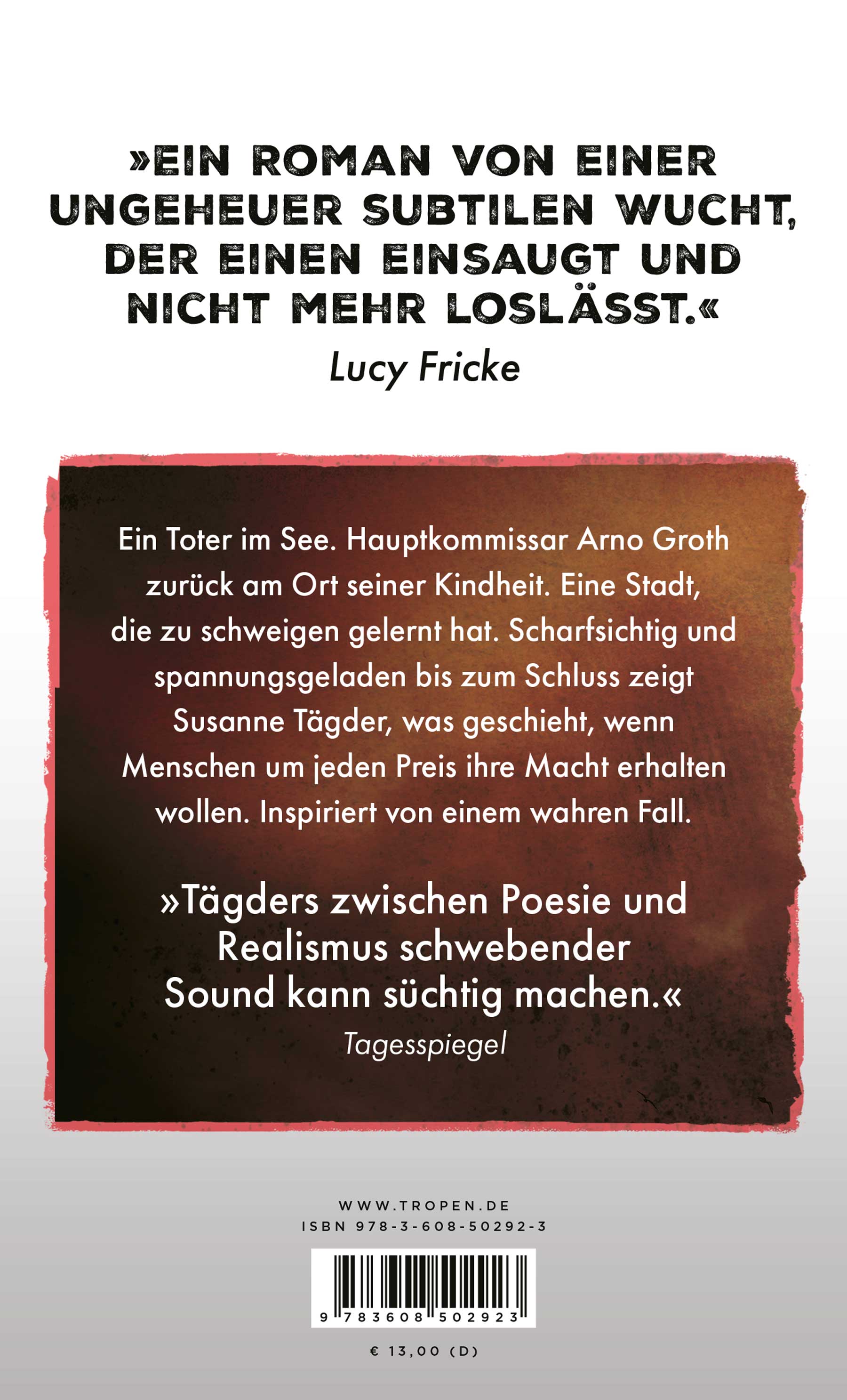 Ein Toter im See. Hauptkommissar Arno Groth zurück am Ort seiner Kindheit. Eine Stadt, die zu schweigen gelernt hat. Scharfsichtig und spannungsgeladen bis zum Schluss zeigt Susanne Tägder, was geschieht, wenn Menschen um jeden Preis ihre Macht erhalten wollen. Inspiriert von einem wahren Fall.