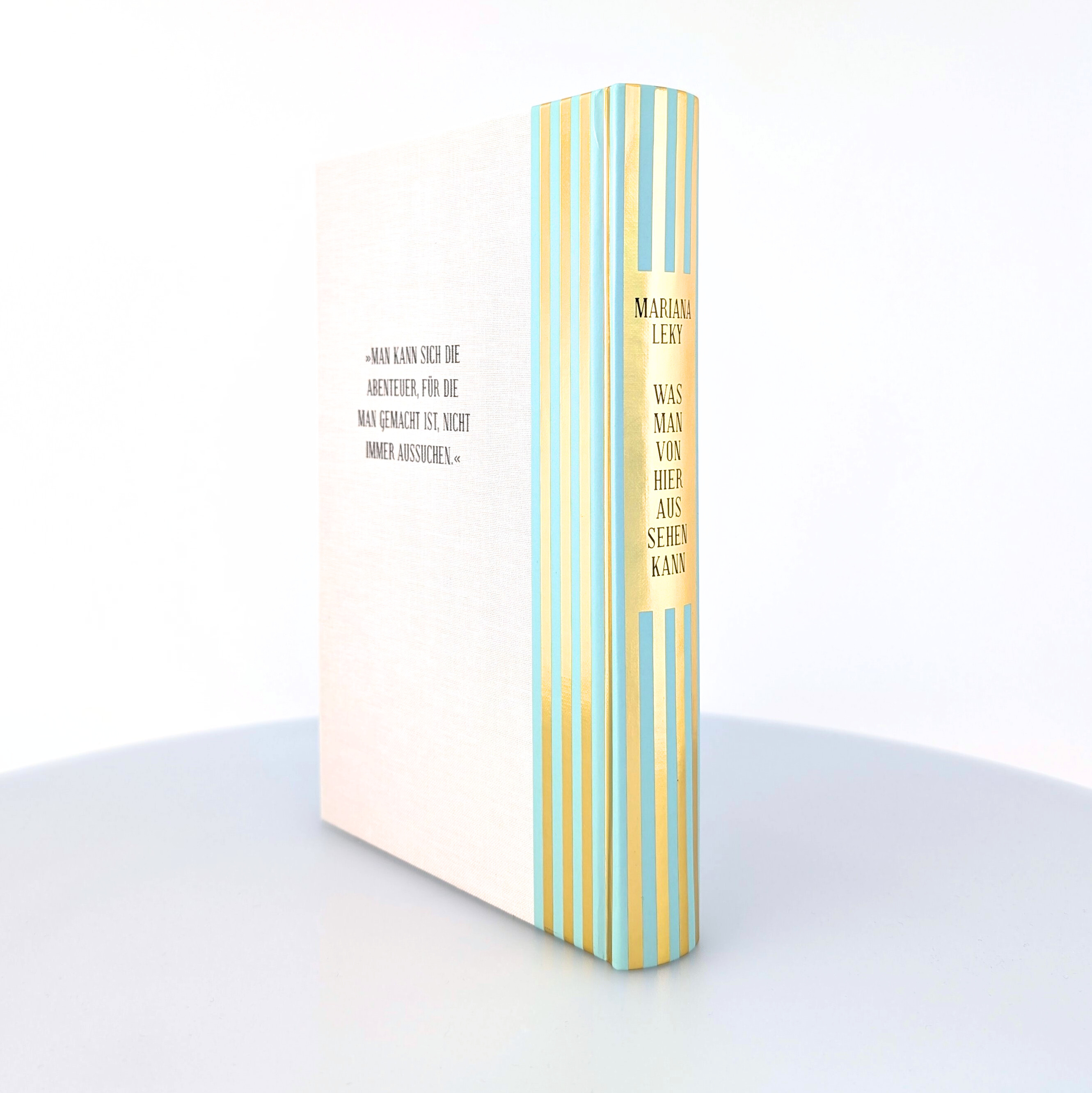 Das Gesamtkunstwerk ist in Türkis, Schwarz und Gold gehalten, mit beigefarbenen Akzenten. Die gebundene Ausgabe ist ein sogenanntes "umgekehrtes Halbleinen", bei dem das Leinen nicht am Rücken des Buches, sondern auf dessen Vorder- und Rückseite zu finden ist. Das naturfarbene Umschlagmaterial ist vorne mit einem Bild und hinten mit Text schwarz bedruckt. Am Buchrücken findet sich die türkis-goldgestreifte Fläche, die sich dann auch auf dem Schuber fortsetzt. Die Goldprägung ist glänzend und leuchtet schön. Ein ganz besonderer Hingucker ist das Vorsatzpapier: Es ist ebenfalls golden.