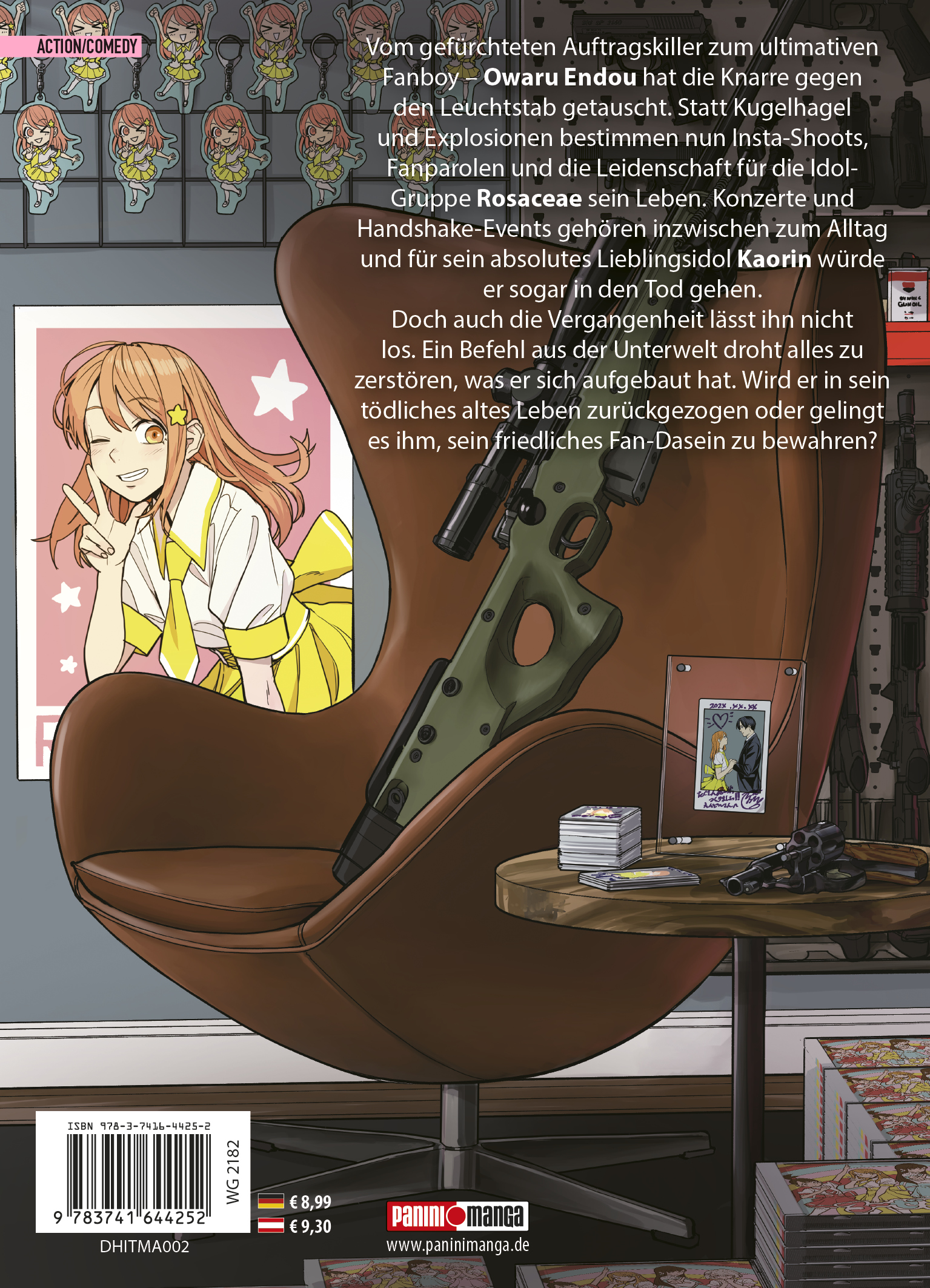 Vom Killer zum ultimativen Fanboy - mit Leuchtstab statt Knarre! Früher war Endo Owaru eine lebende Legende in der Unterwelt, doch eines Tages hing er seinen Job als Profikiller an den Nagel und fand ganz woanders neuen Sinn im Leben: er wurde zum Fanboy und folgt seitdem seinem Idol bis in den Tod! Statt Auftragsmorden stehen jetzt Live-Auftritte und Fanmeetings auf dem Programm - und er genießt jeden Moment in vollen Zügen. Doch die Unterwelt fordert seine Rückkehr! Ein neuer Auftrag holt ihn ruck, zuck zurück aus seiner Traumwelt. Kann Endo sein hart erkämpftes Fan-Dasein aufrechterhalten - oder holt die eigene Vergangenheit ihn eiskalt ein? Das erwartet dich in Band 2: Vom gefürchteten Auftragskiller zum ultimativen Fanboy - Owaru Endou hat die Knarre gegen den Leuchtstab getauscht. Statt Kugelhagel und Explosionen bestimmen nun Insta-Shoots, Fanparolen und die Leidenschaft für die Idol-Gruppe Rosaceae sein Leben. Konzerte und Handshake-Events gehören inzwischen zum Alltag und für sein absolutes Lieblingsidol Kaorin würde er sogar in den Tod gehen. Doch auch die Vergangenheit lässt ihn nicht los. Ein Befehl aus der Unterwelt droht alles zu zerstören, was er sich aufgebaut hat. Wird er in sein tödliches altes Leben zurückgezogen oder gelingt es ihm, sein friedliches Fan-Dasein zu bewahren?Band 2 der explosiven Idol-Action-Comedy! Mit noch mehr Bühnenzauber und einer bunten Prise Fanliebe - und natürlich knallerharten Kämpfen!