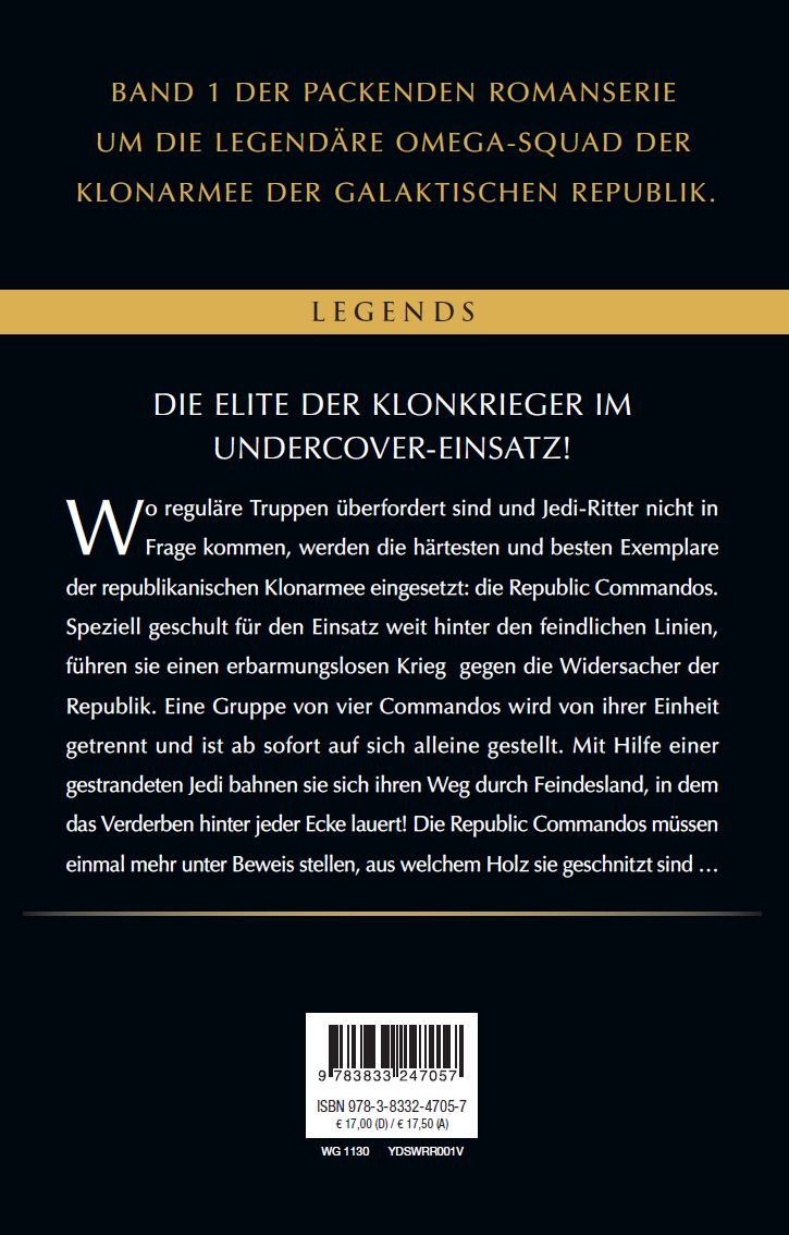 DIE ELITE DER KLONKRIEGER IM UNDERCOVER-EINSATZ! Wo reguläre Truppen überfordert sind und Jedi-Ritter nicht in Frage kommen, werden die härtesten und besten Exemplare der republikanischen Klonarmee eingesetzt: die Republic Commandos. Speziell geschult für den Einsatz weit hinter den feindlichen Linien, führen sie einen erbarmungslosen Krieg gegen die Widersacher der Republik. Eine Gruppe von vier Commandos wird von ihrer Einheit getrennt und ist ab sofort auf sich alleine gestellt. Mit Hilfe einer gestrandeten Jedi bahnen sie sich ihren Weg durch Feindesland, in dem das Verderben hinter jeder Ecke lauert! Die Republic Commandos müssen einmal mehr unter Beweis stellen, aus welchem Holz sie geschnitzt sind ...BAND 1 DER PACKENDEN ROMANSERIE UM DIE LEGENDÄRE OMEGA-SQUAD DER KLONARMEE DER GALAKTISCHEN REPUBLIK.
