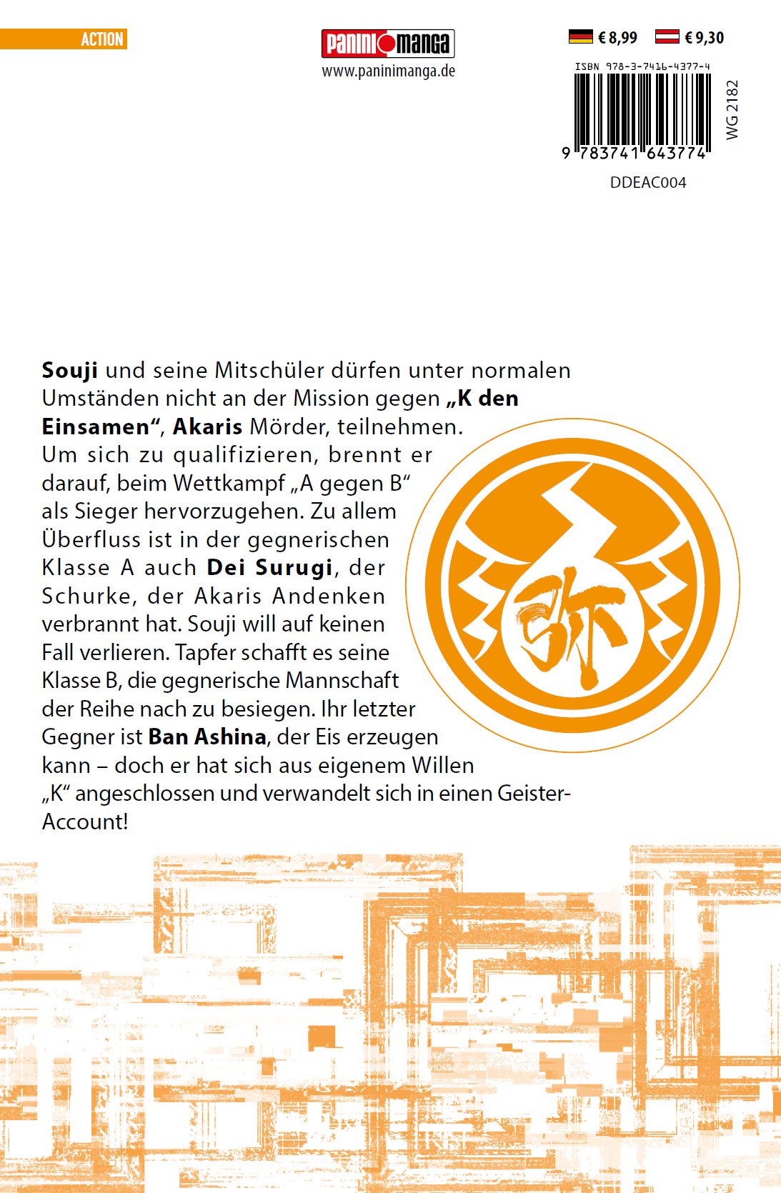 Souji und seine Mitschüler dürfen unter normalen Umständen nicht an der Austreibungs-Mission gegen „K der Einsame“, Akaris Mörder, teilnehmen. Um sich zu qualifizieren, brennt er darauf, beim Wettkampf A gegen B als Sieger hervorzugehen. Zu allem Überfluss ist in der gegnerischen Klasse A auch Dei Surugi, der Schurke, der Akaris Andenken verbrannt hat. Souji will auf keinen Fall verlieren. Tapfer schafft es seine Klasse B, die gegnerische Mannschaft der Reihe nach zu besiegen. Ihr letzter Gegner ist Ban Ashina, der Eis erzeugen kann – doch er hat sich aus eigenem Willen „K“ angeschlossen und verwandelt sich in einen Geister-Account!