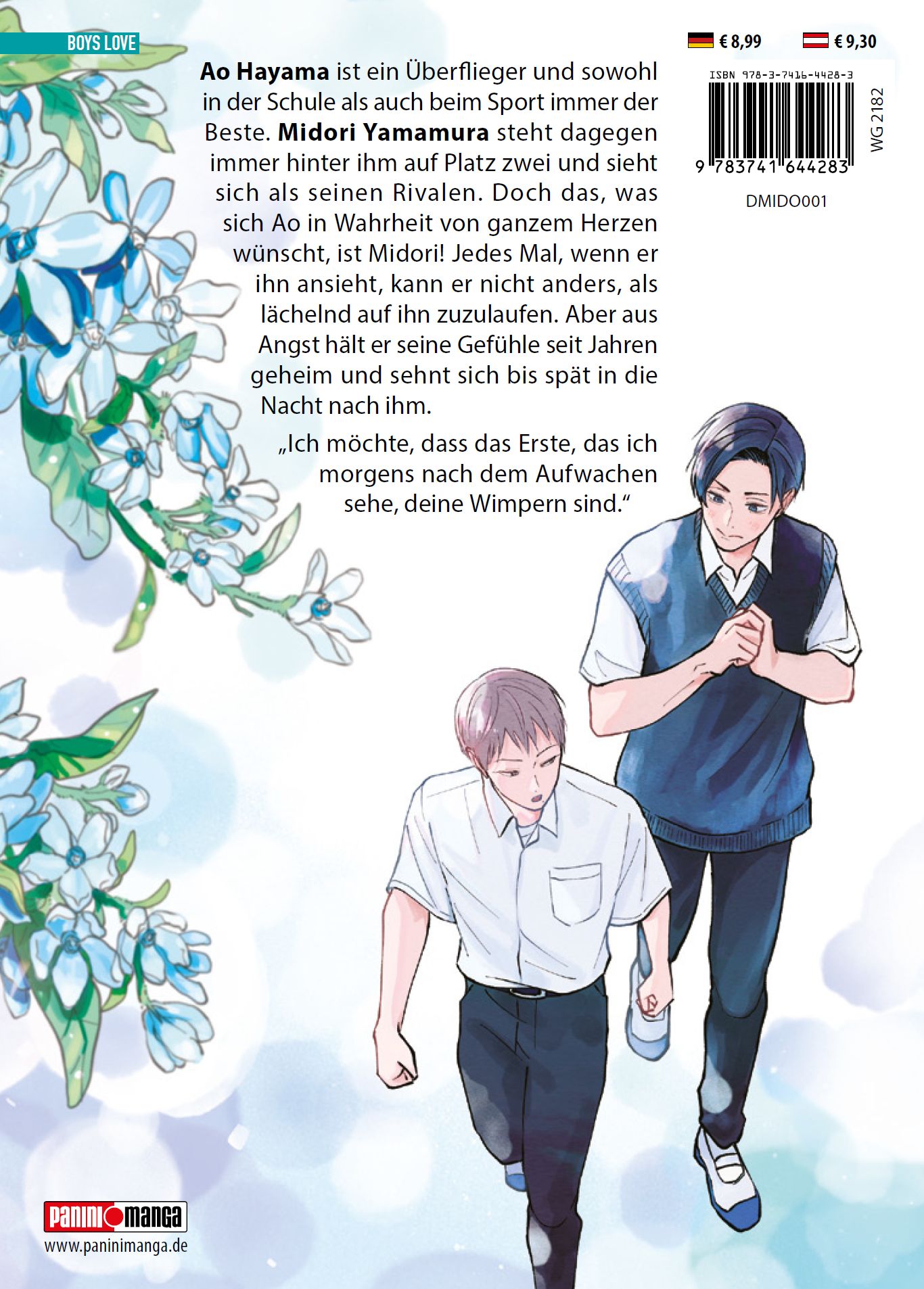 Dieser herzerwärmende BL-Manga erzählt die Geschichte einer unschuldigen und wunderschönen Liebe, die aus einer Rivalität entsteht. Von der Mangaka von "Mein Leben mit Papa und Papa" und "Bis du Ja sagst".Ao Hayama ist ein Überflieger und sowohl in der Schule als auch beim Sport immer der Beste. Midori Yamamura steht dagegen immer hinter ihm auf Platz zwei und sieht sich als seinen Rivalen. Doch das, was sich Ao in Wahrheit von ganzem Herzen wünscht, ist Midori! Jedes Mal, wenn er ihn ansieht, kann er nicht anders, als lächelnd auf ihn zuzulaufen. Aber aus Angst hält er seine Gefühle seit Jahren geheim und sehnt sich bis spät in die Nacht nach ihm. "Ich möchte, dass das Erste, das ich morgens nach dem Aufwachen sehe, deine Wimpern sind."Für Fans von BL-Manga und zuckersüßen Storys!