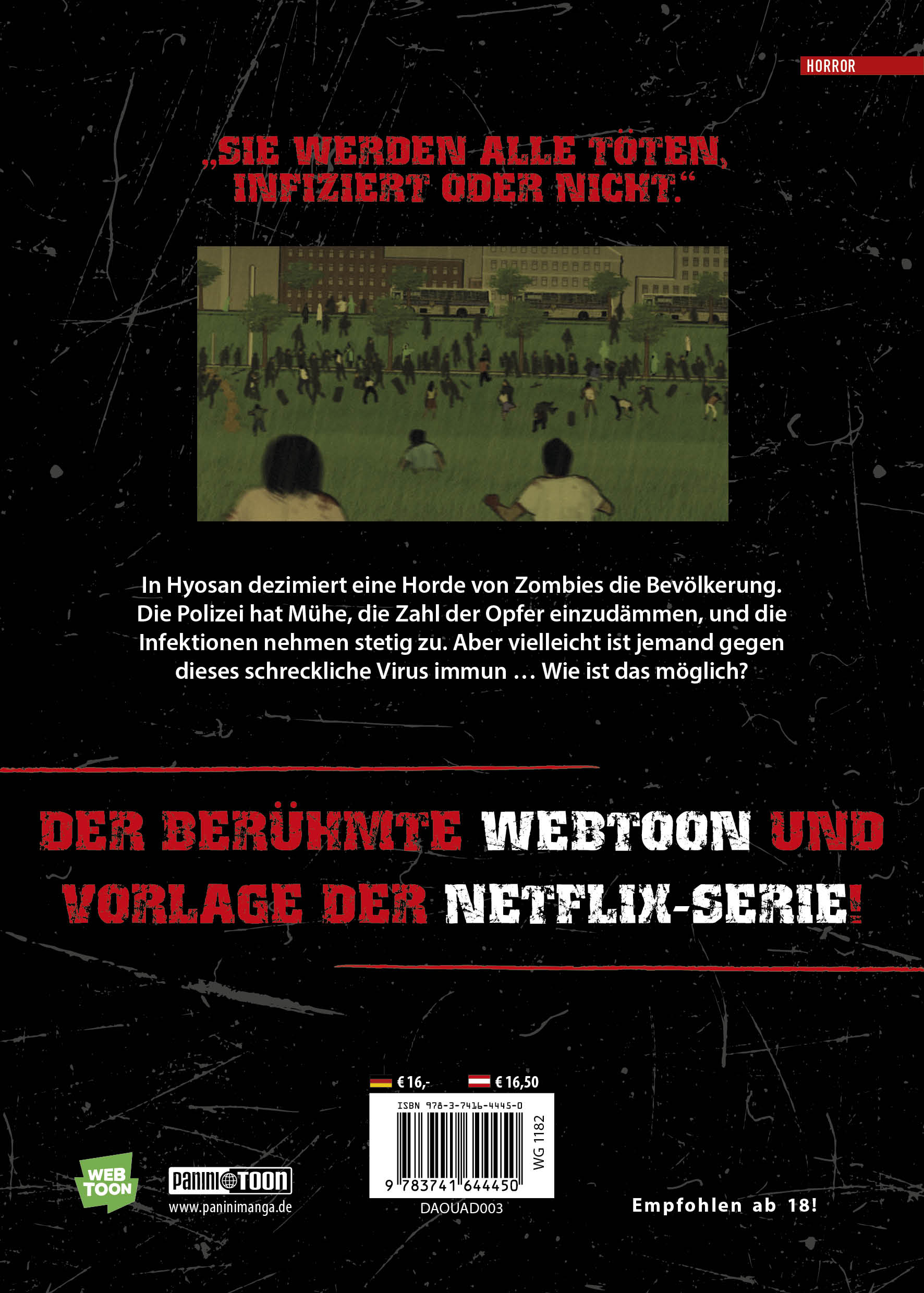 Überleben ist erst der Anfang ... Die Webtoon-Vorlage zum Zombie-Serien-Hit von Netflix!Der Alltag an der Hyosan Oberschule verläuft ohne große Überraschungen - bis die Schüler plötzlich erkennen, dass ein tödliches Virus genau in ihrer Schule ausbricht und seine Opfer in blutrünstige, fleischfressende Monster verwandelt. Panik bricht aus, als das Virus die Schule innerhalb weniger Stunden in ein Chaos stürzt. Die Flucht scheint unmöglich, und die Schüler sind gefangen in einem Albtraum, umgeben von zombifizierten Freunden und Lehrern. Jeder Schritt könnte ihr letzter sein, und sie müssen all ihren Mut und Einfallsreichtum aufbringen, um einen Weg zu finden, diesem Horror zu entkommen und zu überleben. Das erwartet dich in Band 3:"SIE WERDEN ALLE TÖTEN, INFIZIEREN ODER NICHT."In Hyosan dezimiert eine Horde von Zombies die Bevölkerung. Die Polizei hat Mühe, die Zahl der Opfer einzudämmen, und die Infektionen nehmen stetig zu. Aber vielleicht ist jemand gegen dieses schreckliche Virus immun ... Wie ist das möglich?DER BERÜHMTE WEBTOON UND VORLAGE DER NETFLIX-SERIE!Für Fans von The Walking Dead, Dawn of the Dead, 28 Days Later, World War Z und Train to Busan!Empfohlen ab 18 Jahren!