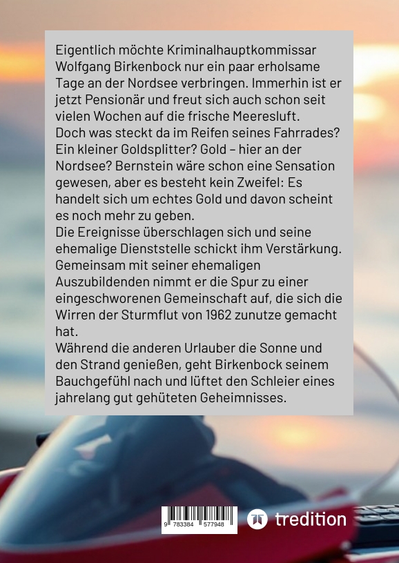 Eigentlich möchte Kriminalhauptkommissar Wolfgang Birkenbock nur ein paar erholsame Tage an der Nordsee verbringen. Immerhin ist er jetzt Pensionär und freut sich auch schon seit vielen Wochen auf die frische Meeresluft.Doch was steckt da im Reifen seines Fahrrades? Ein kleiner Goldsplitter? Gold - hier an der Nordsee? Bernstein wäre schon eine Sensation gewesen, aber es besteht kein Zweifel: Es handelt sich um echtes Gold und davon scheint es noch mehr zu geben.Die Ereignisse überschlagen sich und seine ehemalige Dienststelle schickt ihm Verstärkung. Gemeinsam mit seiner ehemaligen Auszubildenden nimmt er die Spur zu einer eingeschworenen Gemeinschaft auf, die sich die Wirren der Sturmflut von 1962 zunutze gemacht hat. Und während die anderen Urlauber die Sonne und den Strand genießen, geht Birkenbock seinem Bauchgefühl nach und lüftet den Schleier eines jahrelang gut gehüteten Geheimnisses.
