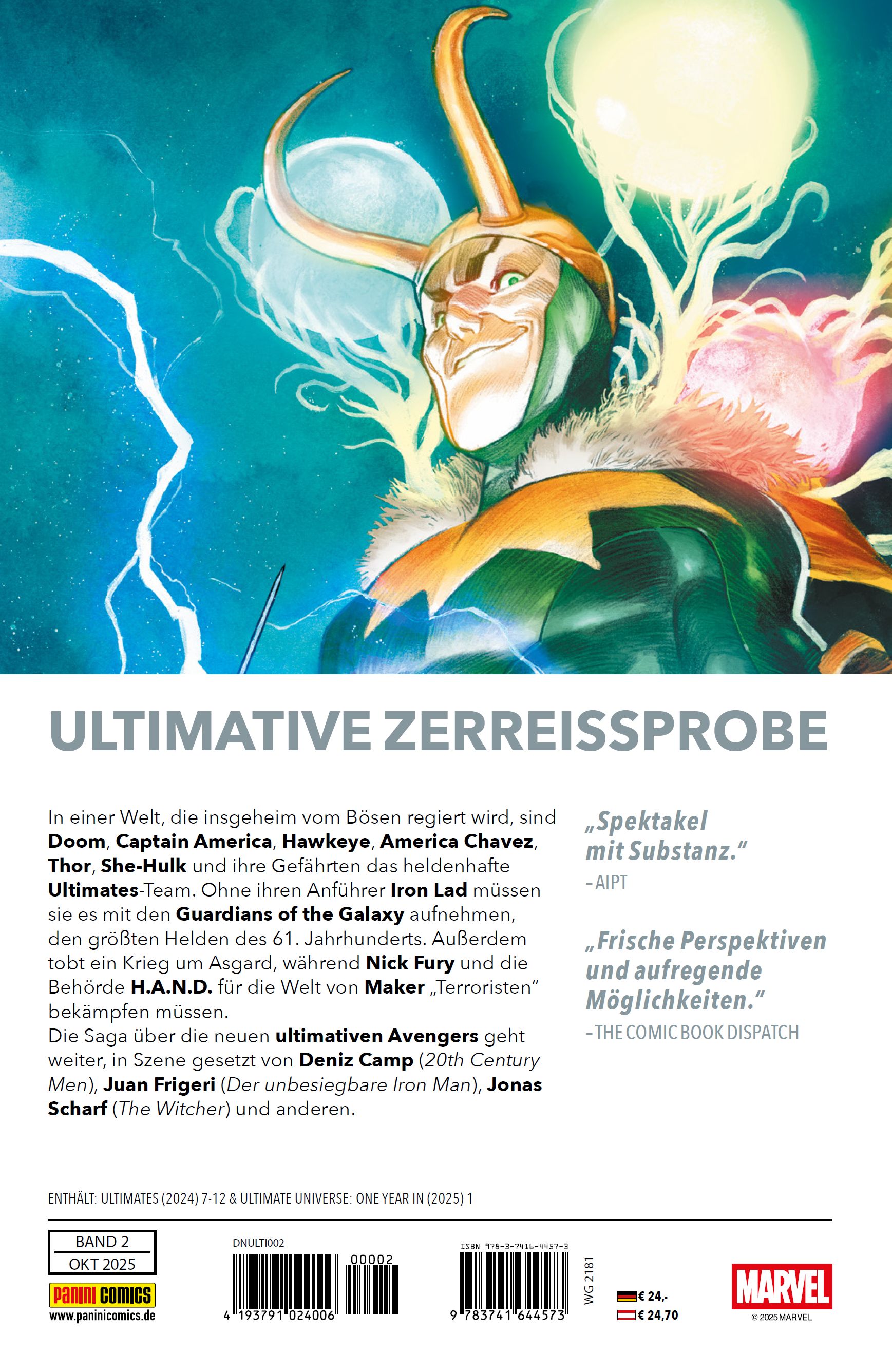 ULTIMATIVE ZERREISPROBEIn einer Welt, die insgeheim vom Bösen regiert wird, sind Doom, Captain America, Hawkeye, America Chavez, Thor, She-Hulk und ihre Gefährten das heldenhafte Ultimates-Team. Ohne ihren Anführer Iron Lad müssen sie es mit den Guardians of the Galaxy aufnehmen, den größten Helden des 61. Jahrhunderts. Außerdem tobt ein Krieg um Asgard, während Nick Fury und die Behörde HAND für die Welt des Makers "Terroristen" bekämpfen müssen. Die Saga über die neuen ultimativen Avengers geht weiter, in Szene gesetzt von Deniz Camp (20th Century Men), Juan Frigeri (Der unbesiegbare Iron Man), Jonas Scharf (The Witcher) und anderen. ENTHÄLT: ULTIMATES (2024) 7-12 & ULTIMATES UNIVERSE: ONE YEAR IN (2025) 1