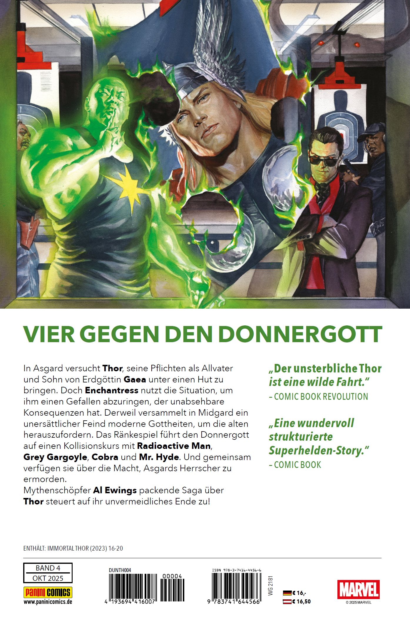 VIER GEGEN DEN DONNERGOTTIn Asgard versucht Thor seine Pflichten als Allvater und Kind von Erdgöttin Gaea unter einen Hut zu bringen. Doch Enchantress nutzt die Situation, um ihm einen Gefallen abzuringen, der unabsehbare Konsequenzen hat. Derweil versammelt in Midgard ein unersättlicher Feind moderne Gottheiten, um die alten herauszufordern. Das Ränkespiel führt den Donnergott auf einen Kollisionskurs mit Radioactive Man, Grey Gargoyle, Cobra und Mr. Hyde. Und gemeinsam verfügen sie über die Macht, Asgards Herrscher zu ermorden. Mythenschöpfer Al Ewings packende Saga über Thor steuert auf ihr unvermeidliches Ende zu! ENTHÄLT: IMMORTAL THOR (2023) 16-20