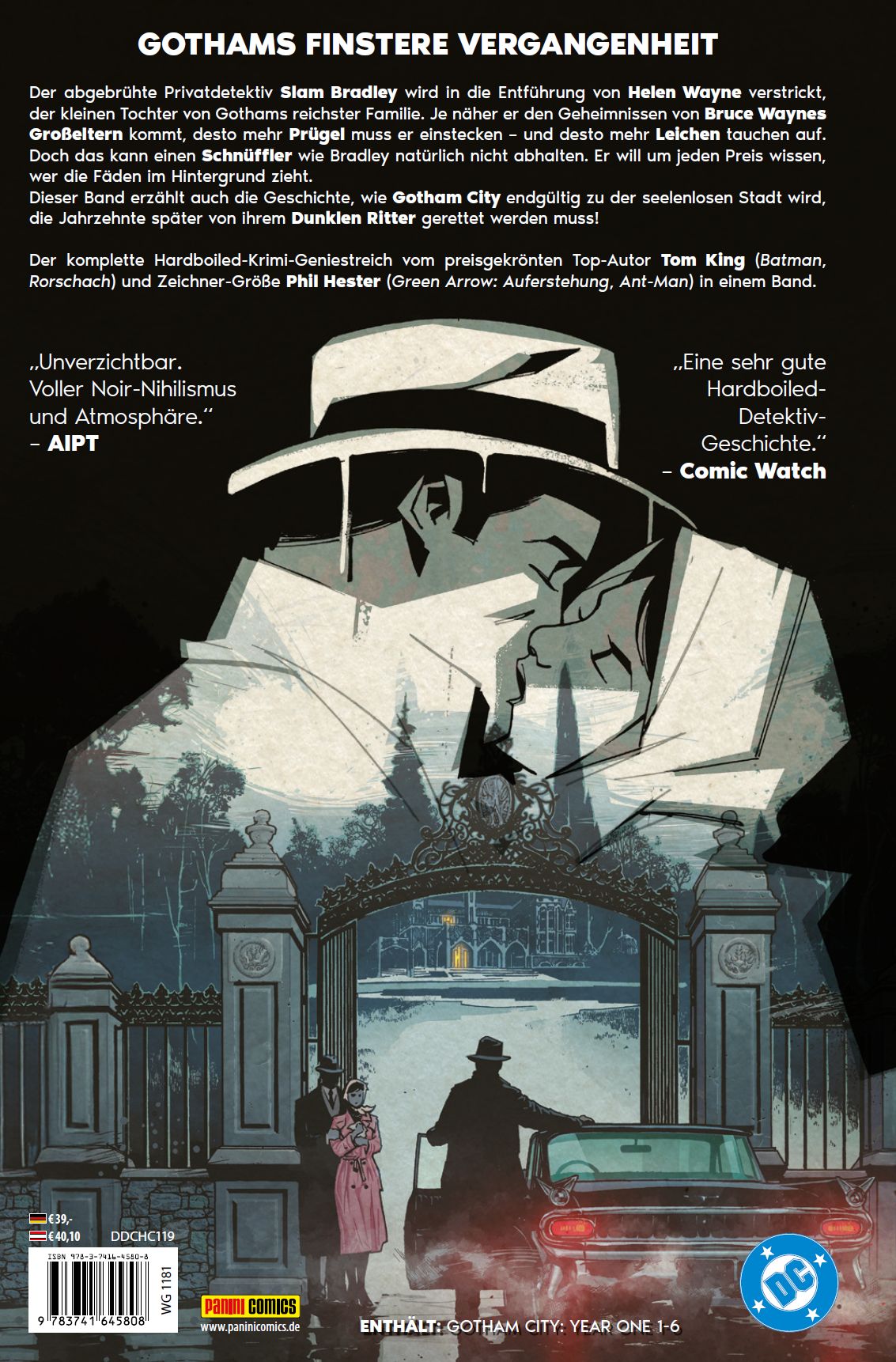 GOTHAMS FINSTERE VERGANGENHEIT Der abgebrühte Privatdetektiv Slam Bradley wird in die Entführung von Helen Wayne verstrickt, der kleinen Tochter von Gothams reichster Familie. Je näher Slam den Geheimnissen von Bruce Waynes Großeltern kommt, desto mehr Prügel muss er einstecken - und desto mehr Leichen tauchen auf. Doch das kann einen Schnüffler wie Bradley natürlich nicht abhalten. Er will um jeden Preis wissen, wer die Fäden im Hintergrund zieht. Dieser Band erzählt auch die Geschichte, wie Gotham City endgültig zu der seelenlosen Stadt wird, die Jahrzehnte später von ihrem Dunklen Ritter gerettet werden muss! Der komplette Hardboiled-Krimi-Geniestreich vom preisgekrönten Top-Autor Tom King (Batman, Rorschach) und Zeichner-Größe Phil Hester (Green Arrow: Auferstehung, Ant-Man) in einem Band.ENTHÄLT: GOTHAM CITY: YEAR ONE 1-6