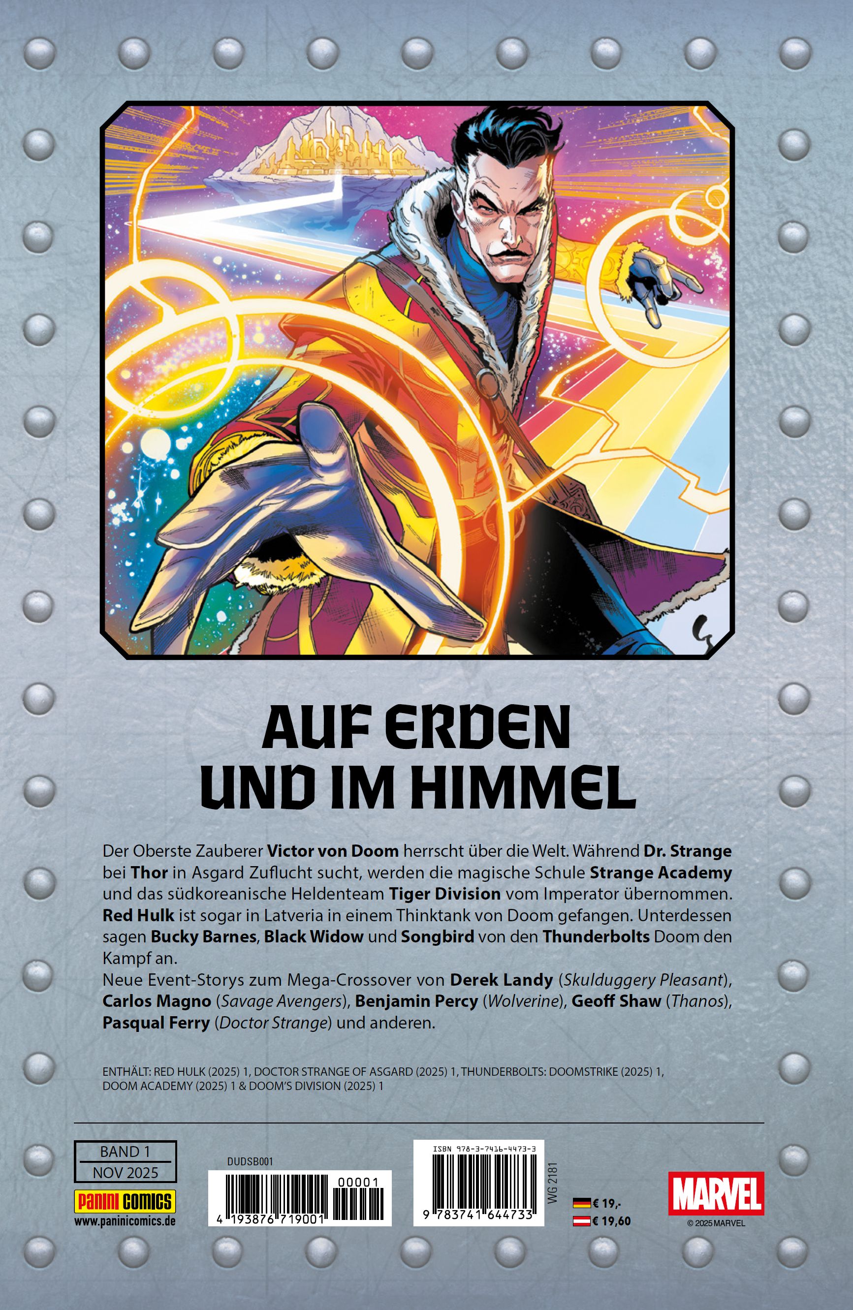AUF ERDEN UND IM HIMMEL Der Oberste Zauberer Victor von Doom herrscht über die Welt. Während Dr. Strange bei Thor in Asgard Zuflucht sucht, werden die magische Schule Strange Academy und das südkoreanische Heldenteam Tiger Division vom Imperator übernommen. Red Hulk ist sogar in Latveria in einem Thinktank von Doom gefangen. Unterdessen sagen Bucky Barnes, Black Widow und Songbird von den Thunderbolts Doom den Kampf an. Neue Event-Storys zum Mega-Crossover von Derek Landy (Skulduggery Pleasant), Carlos Magno (Savage Avengers), Benjamin Percy (Wolverine), Geoff Shaw (Thanos), Pasqual Ferry (Doctor Strange) und anderen. ENTHÄLT: RED HULK (2025) 1, DOCTOR STRANGE OF ASGARD (2025) 1, THUNDERBOLTS: DOOMSTRIKE (2025) 1, DOOM ACADEMY (2025) 1 & DOOM'S DIVISION (2025) 1