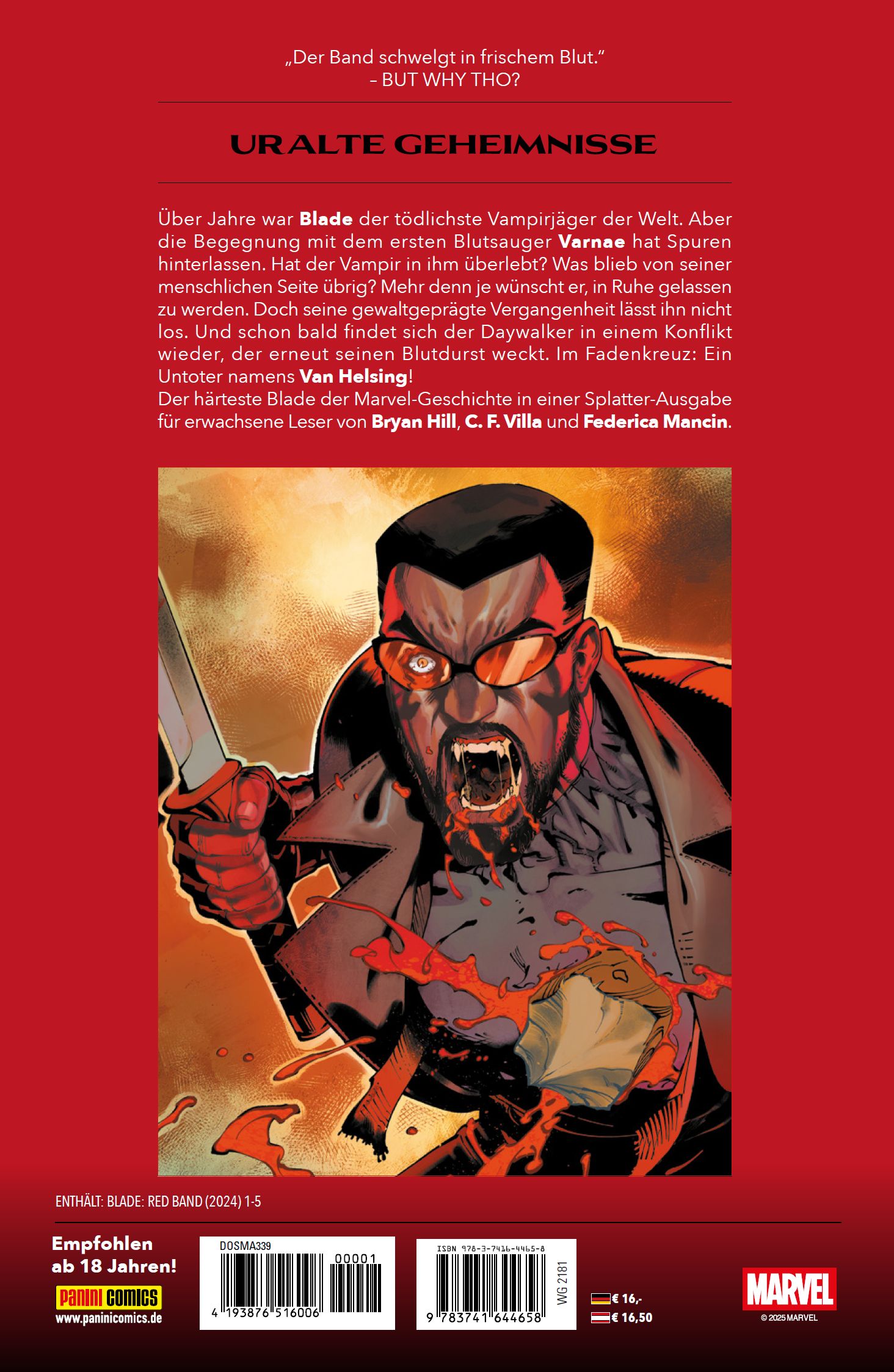 URALTE GEHEIMNISSE Über Jahre war Blade der tödlichste Vampirjäger der Welt. Aber die Begegnung mit dem ersten Blutsauger Varnae hat Spuren hinterlassen. Hat der Vampir in ihm überlebt? Was blieb von seiner menschlichen Seite übrig? Mehr denn je wünscht er, in Ruhe gelassen zu werden. Doch seine gewaltgeprägte Vergangenheit lässt ihn nicht los. Und schon bald findet sich der Daywalker in einem Konflikt wieder, der erneut seinen Blutdurst weckt. Im Fadenkreuz: Ein Untoter namens Van Helsing! Der härteste Blade der Marvel-Geschichte in einer Splatter-Ausgabe für erwachsene Leser von Bryan Hill, C. F. Villa und Federica Mancin.ENTHÄLT: BLADE: RED BAND (2024) 1-5Empfohlen ab 18 Jahren!