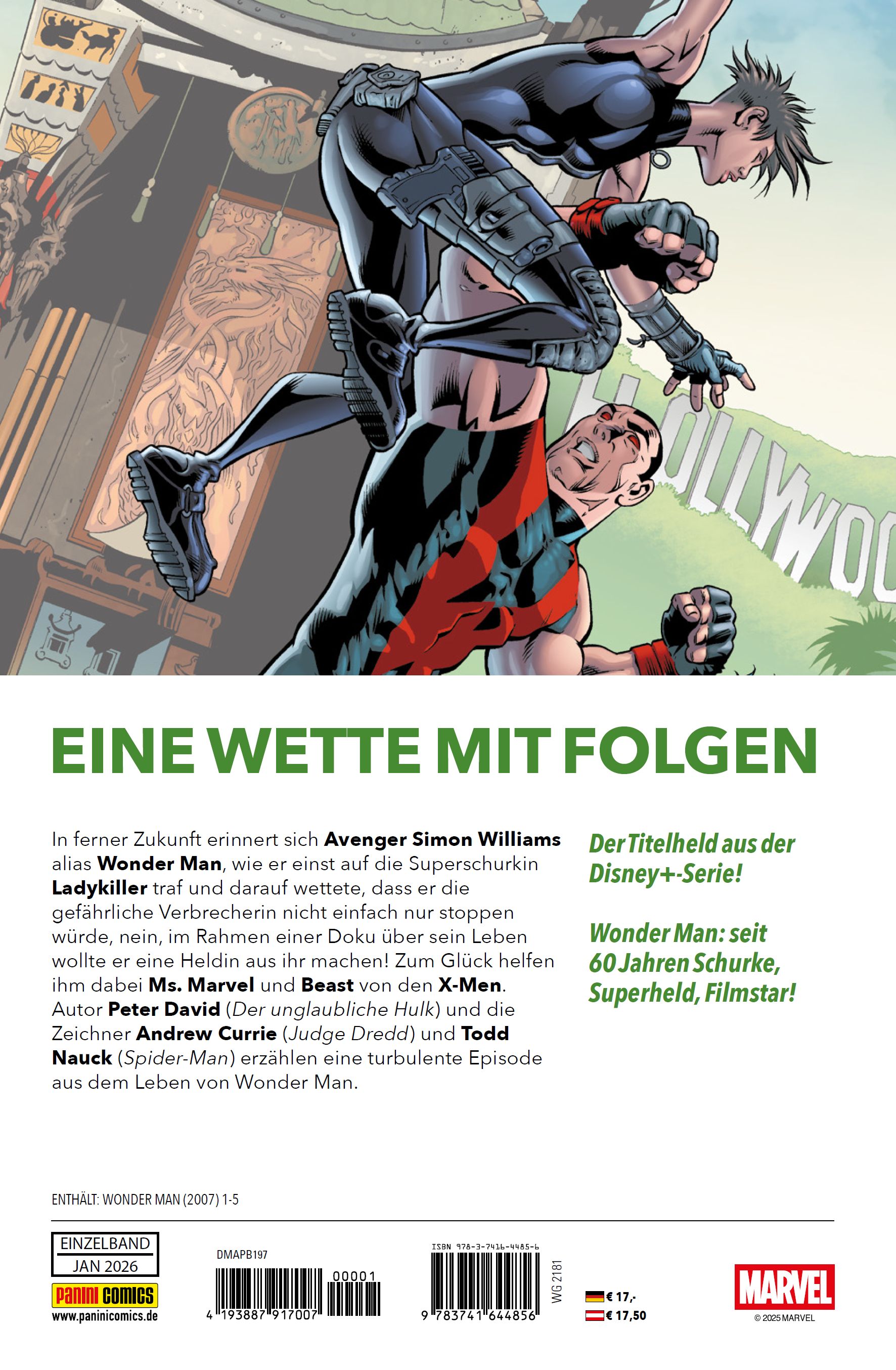 EINE WETTE MIT FOLGEN In ferner Zukunft erinnert sich Avenger Simon Williams alias Wonder Man, wie er einst auf die Superschurkin Ladykiller traf und darauf wettete, dass er die gefährliche Verbrecherin nicht einfach nur stoppen würde, nein, im Rahmen einer Doku über sein Leben wollte er eine Heldin aus ihr machen! Zum Glück helfen ihm dabei Ms. Marvel und Beast von den X-Men. Autor Peter David (Der unglaubliche Hulk) und die Zeichner Andrew Currie (Judge Dredd) und Todd Nauck (Spider-Man) erzählen eine turbulente Episode aus dem Leben von Wonder Man. ENTHÄLT: WONDER MAN (2007) 1-5