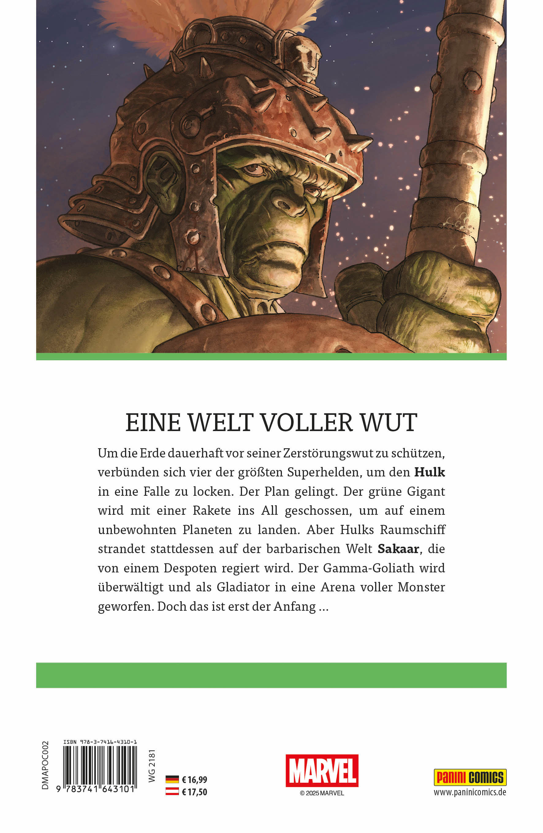 EINE WELT VOLLER WUTUm die Erde dauerhaft vor seiner Zerstörungswut zu schützen, verbünden sich vier der größten Superhelden, um den Hulk in eine Falle zu locken. Der Plan gelingt. Der grüne Gigant wird mit einer Rakete ins All geschossen, um auf einem unbewohnten Planeten zu landen. Aber Hulks Raumschiff strandet stattdessen auf der barbarischen Welt Sakaar, die von einem Despoten regiert wird. Der Gamma-Goliath wird überwältigt und als Gladiator in eine Arena voller Monster geworfen. Doch das ist erst der Anfang ...