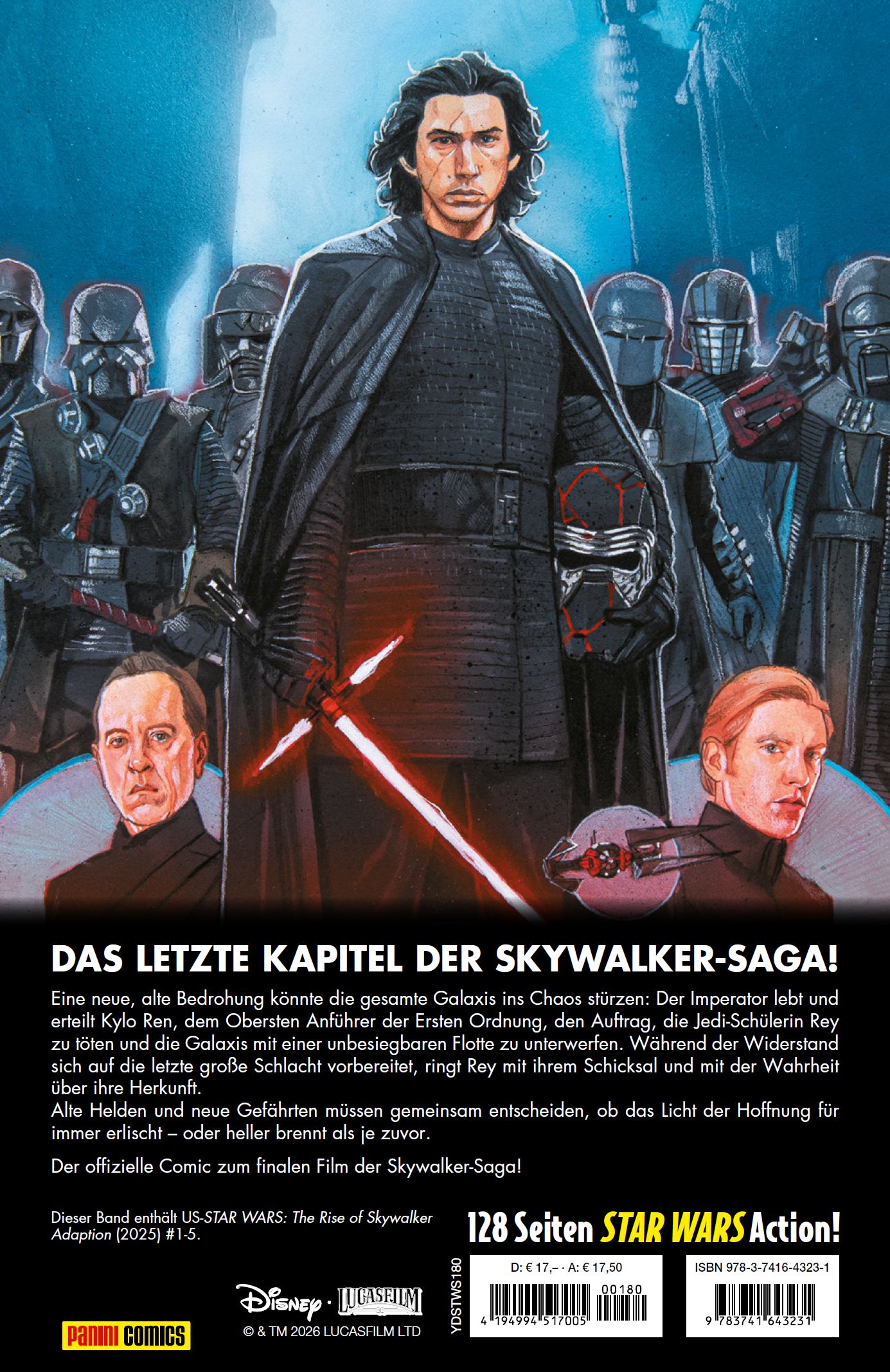 DAS LETZTE KAPITEL DER SKYWALKER-SAGA! Eine neue, alte Bedrohung könnte die gesamte Galaxis ins Chaos stürzen: Der Imperator lebt und erteilt Kylo Ren, dem Obersten Anführer der Ersten Ordnung, den Auftrag, die Jedi-Schülerin Rey zu töten und die Galaxis mit einer unbesiegbaren Flotte zu unterwerfen. Während der Widerstand sich auf die letzte große Schlacht vorbereitet, ringt Rey mit ihrem Schicksal und mit der Wahrheit über ihre Herkunft. Alte Helden und neue Gefährten müssen gemeinsam entscheiden, ob das Licht der Hoffnung für immer erlischt - oder heller brennt als je zuvor. Der offizielle Comic zum finalen Film der Skywalker-Saga!Dieser Band enthält US-STAR WARS: The Rise of Skywalker Adaption (2025) #1-5.