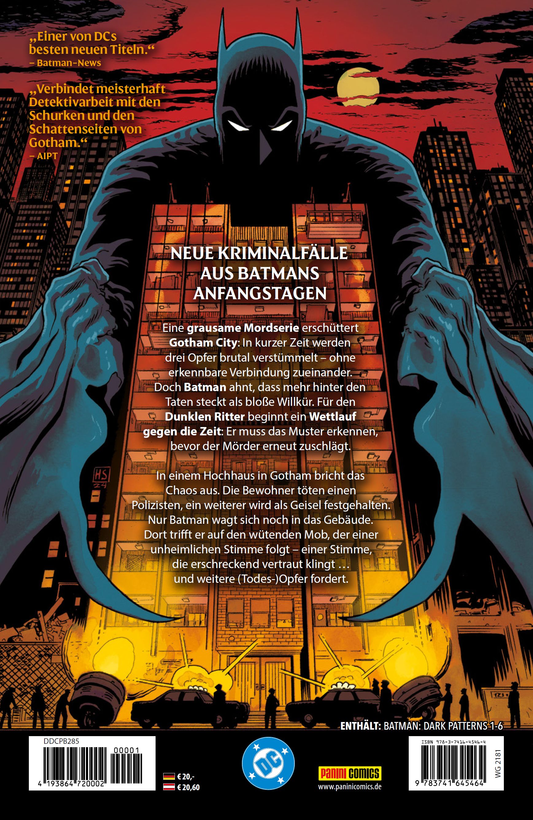 NEUE KRIMINALFÄLLE AUS BATMANS ANFANGSTAGEN Eine grausame Mordserie erschüttert Gotham City: In kurzer Zeit werden drei Opfer brutal verstümmelt - ohne erkennbare Verbindung zueinander. Doch Batman ahnt, dass mehr hinter den Taten steckt als bloße Willkür. Für den Dunklen Ritter beginnt ein Wettlauf gegen die Zeit: Er muss das Muster erkennen, bevor der Mörder erneut zuschlägt. In einem Hochhaus in Gotham bricht das Chaos aus. Die Bewohner töten einen Polizisten, ein weiterer wird als Geisel festgehalten. Nur Batman wagt sich noch in das Gebäude. Dort trifft er auf den wütenden Mob, der einer unheimlichen Stimme folgt - einer Stimme, die erschreckend vertraut klingt ... und weitere (Todes-)Opfer fordert.ENTHÄLT: BATMAN: BATMAN: DARK PATTERNS 1-6