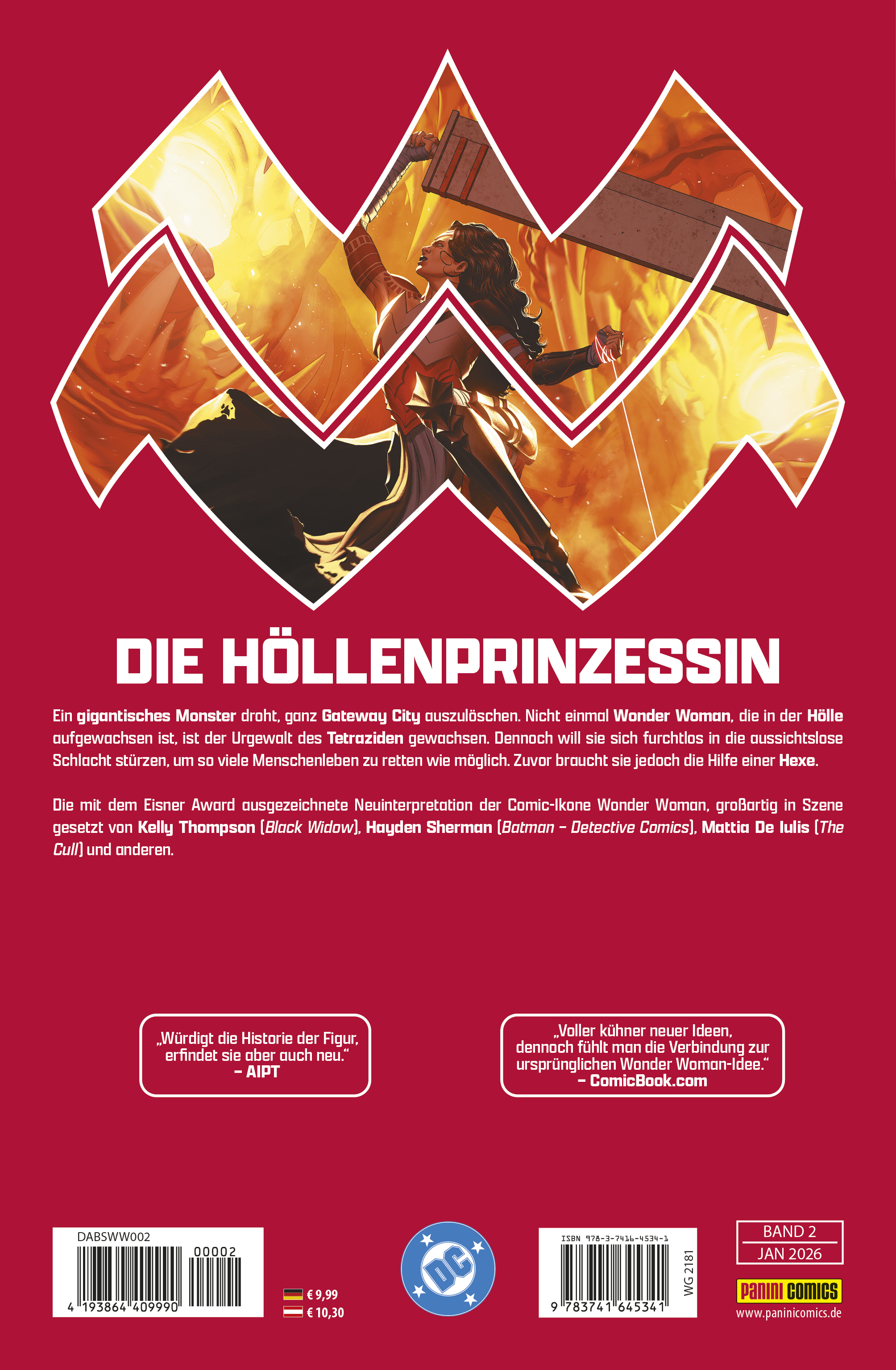 DIE HÖLLENPRINZESSINEin gigantisches Monster droht, ganz Gateway City auszulöschen. Nicht einmal Wonder Woman, die in der Hölle aufgewachsen ist, ist der Urgewalt des Tetraziden gewachsen. Dennoch will sie sich furchtlos in die aussichtslose Schlacht stürzen, um so viele Menschenleben zu retten wie möglich. Zuvor braucht sie jedoch die Hilfe einer Hexe. Die mit dem Eisner Award ausgezeichnete Neuinterpretation der Comic-Ikone Wonder Woman, großartig in Szene gesetzt von Kelly Thompson (Black Widow), Hayden Sherman (Batman - Detective Comics), Mattia De Iulis (The Cull) und anderen.