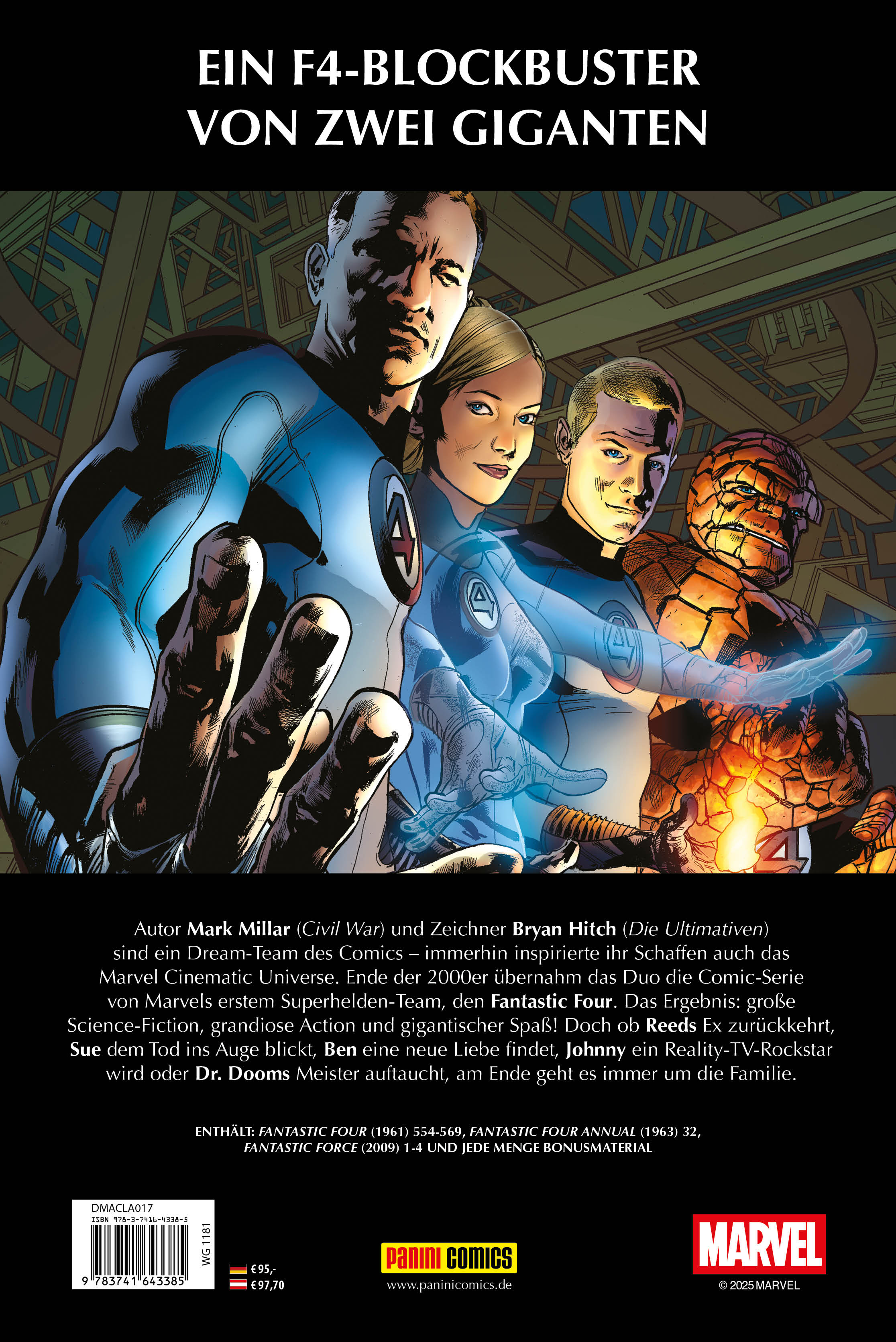 EIN F4-BLOCKBUSTER VON ZWEI GIGANTENAutor Mark Millar (Civil War) und Zeichner Bryan Hitch (Die Ultimativen) sind ein Dream-Team des Comics - immerhin inspirierte ihr Schaffen auch das Marvel Cinematic Universe. Ende der 2000er übernahm das Duo die Comic-Serie von Marvels erstem Superhelden-Team, den Fantastic Four. Das Ergebnis: große Science-Fiction, grandiose Action und gigantischer Spaß! Doch ob Reeds Ex zurückkehrt, Sue dem Tod ins Auge blickt, Ben eine neue Liebe findet, Johnny ein Reality-TV-Rockstar wird oder Dr. Dooms Meister auftaucht, am Ende geht es immer um die Familie. ENTHÄLT: FANTASTIC FOUR (1961) 554-569, FANTASTIC FOUR ANNUAL (1963) 32, FANTASTIC FORCE (2009) 1-4 UND JEDE MENGE BONUSMATERIAL