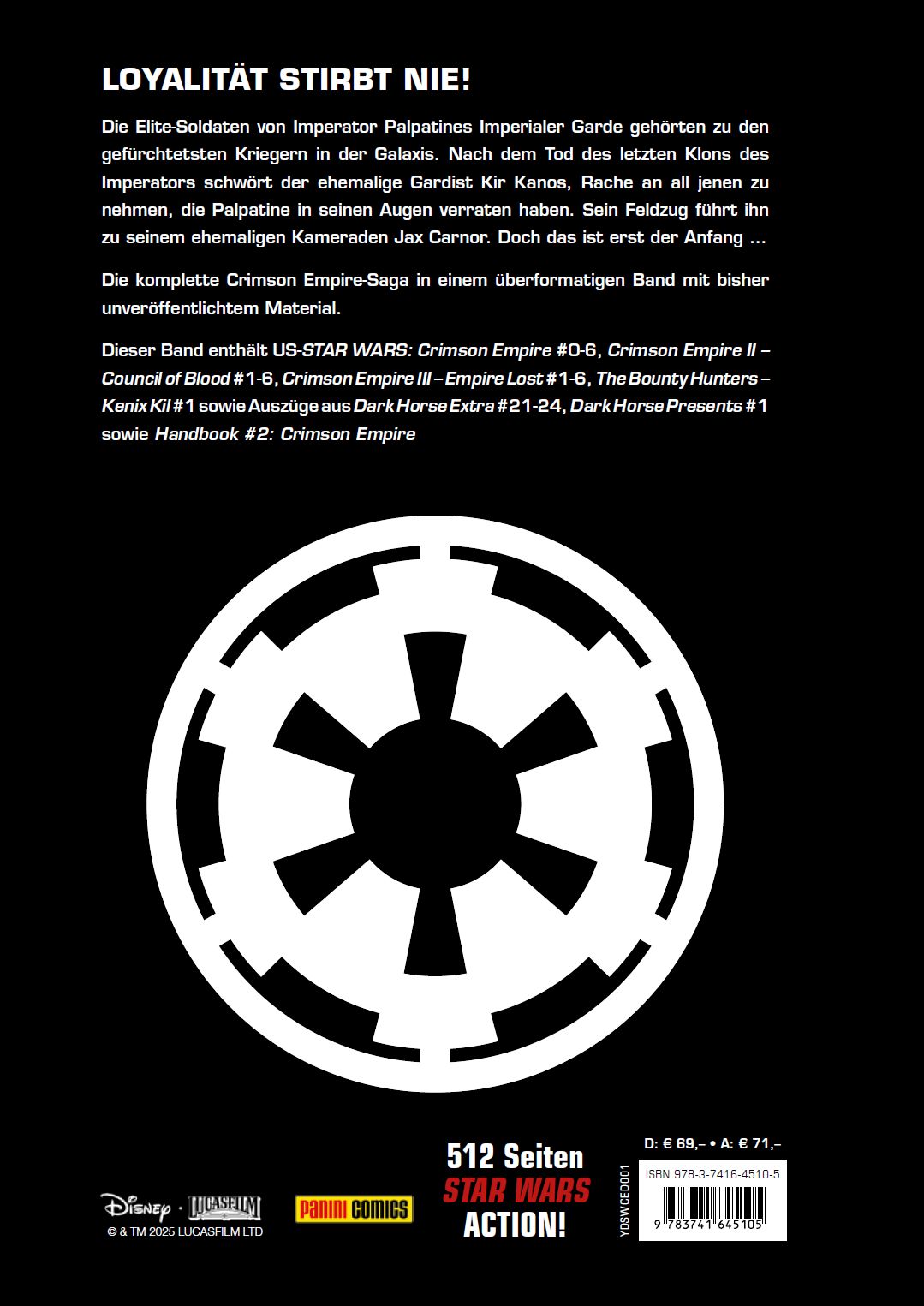 | Original-Titel | US-Star Wars: Crimson Empire #0-6, Crimson Empire II – Council of Blood #1-6, Crimson Empire III – Empire Lost #1-6, The Bounty Hunters – Kenix Kil #1 sowie Auszüge aus Dark Horse Extra #21-24, Dark Horse Presents #1 sowie Handbook #2: Crimson Empire |
