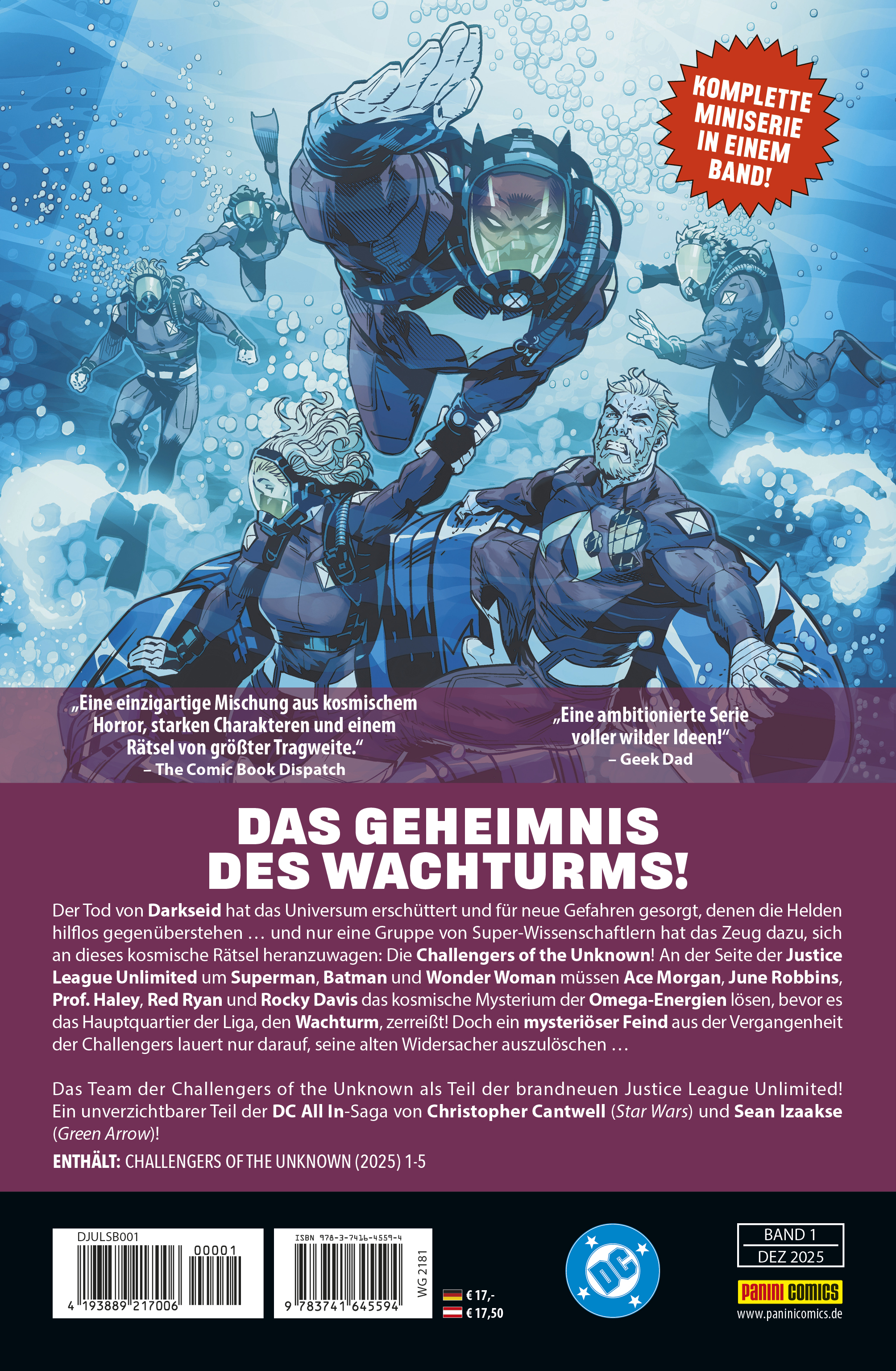 DAS GEHEIMNIS DES WACHTURMS! Der Tod von Darkseid hat das Universum erschüttert und für neue Gefahren gesorgt, denen die Helden hilflos gegenüberstehen ... und nur eine Gruppe von Super-Wissenschaftlern hat das Zeug dazu, sich an dieses kosmische Rätsel heranzuwagen: Die Challengers of the Unknown! An der Seite der Justice League Unlimited um Superman, Batman und Wonder Woman müssen Ace Morgan, June Robbins, Prof. Haley, Red Ryan und Rocky Davis das kosmische Mysterium der Omega-Energien lösen, bevor es das Hauptquartier der Liga, den Wachturm, zerreißt! Doch ein mysteriöser Feind aus der Vergangenheit der Challengers lauert nur darauf, seine alten Widersacher auszulöschen ... Das Team der Challengers of the Unknown als Teil der brandneuen Justice League Unlimited! Ein unverzichtbarer Teil der DC All in-Saga von Christopher Cantwell (Star Wars) und Sean Izaakse (Green Arrow)!ENTHÄLT: CHALLENGERS OF THE UNKNOWN (2025) 1-5Komplette Mini-Serie in einem Band!