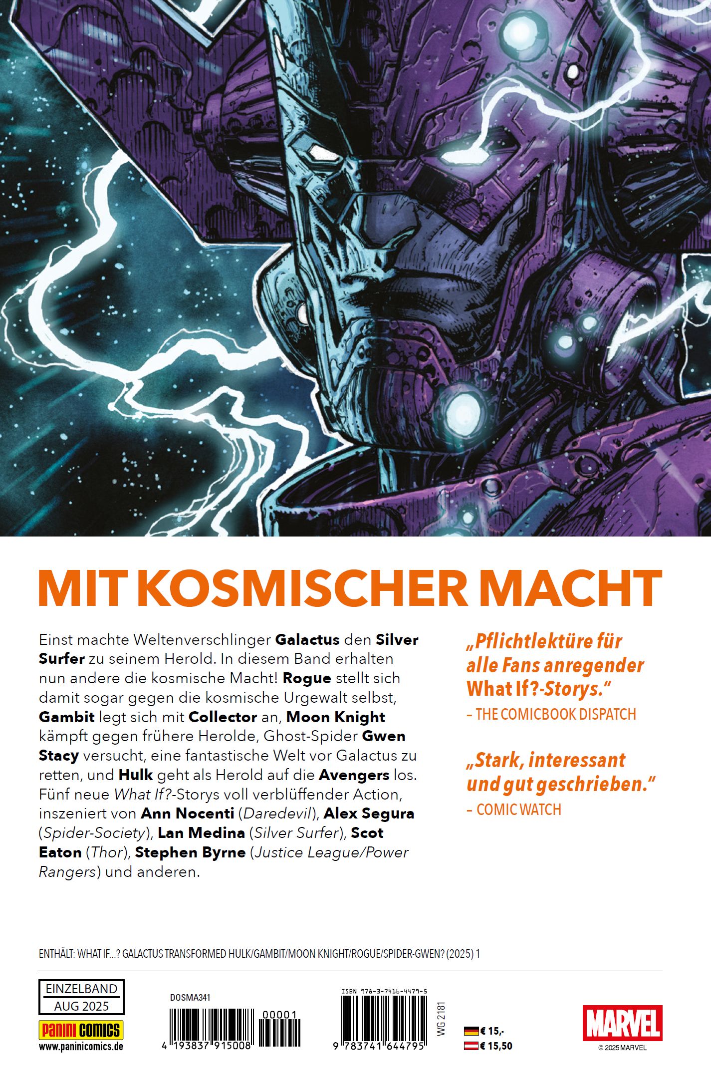 MIT KOSMISCHER MACHT Einst machte Weltenverschlinger Galactus den Silver Surfer zu seinem Herold. In diesem Band erhalten nun andere die kosmische Macht! Rogue stellt sich damit sogar gegen die kosmische Urgewalt selbst, Gambit legt sich mit Collector an, Moon Knight kämpft gegen frühere Herolde, Ghost-Spider Gwen Stacy versucht, eine fantastische Welt vor Galactus zu retten, und Hulk geht als Herold auf die Avengers los. Fünf neue What If?-Storys voll verblüffender Action, inszeniert von Ann Nocenti (Daredevil), Alex Segura (Spider-Society), Lan Medina (Silver Surfer), Scot Eaton (Thor), Stephen Byrne (Justice League/Power Rangers) und anderen.ENTHÄLT: WHAT IF...? GALACTUS TRANSFORMED HULK/GAMBIT/MOON KNIGHT/ROGUE/SPIDER-GWEN? (2025) 1