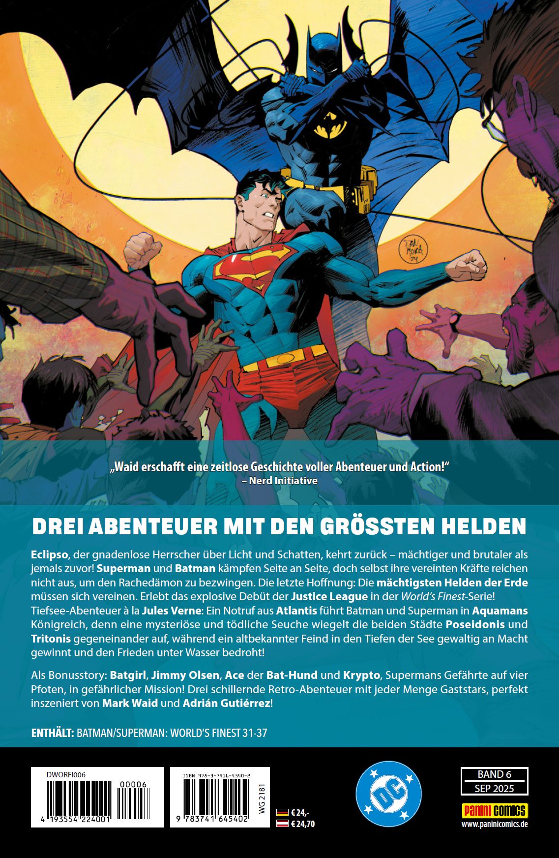DREI ABENTEUER MIT DEN GRÖSSTEN HELDEN Eclipso, der gnadenlose Herrscher über Licht und Schatten, kehrt zurück - mächtiger und brutaler als jemals zuvor! Superman und Batman kämpfen Seite an Seite, doch selbst ihre vereinten Kräfte reichen nicht aus, um den Rachedämon zu bezwingen. Die letzte Hoffnung: Die mächtigsten Helden der Erde müssen sich vereinen. Erlebt das explosive Debüt der Justice League in der World's Finest-Serie! Tiefsee-Abenteuer à la Jules Verne: Ein Notruf aus Atlantis führt Batman und Superman in Aquamans Königreich, denn eine mysteriöse und tödliche Seuche wiegelt die beiden Städte Poseidonis und Tritonis gegeneinander auf, während ein altbekannter Feind in den Tiefen der See gewaltig an Macht gewinnt und den Frieden unter Wasser bedroht! Als Bonusstory: Batgirl, Jimmy Olsen, Ace, der Bat-Hund, und Krypto, Supermans Gefährte auf vier Pfoten, in gefährlicher Mission! Drei schillernde Retro-Abenteuer mit jeder Menge Gaststars, perfekt inszeniert von Mark Waid und Adrián Gutiérrez!ENTHÄLT: BATMAN/SUPERMAN: WORLD'S FINEST 31-37