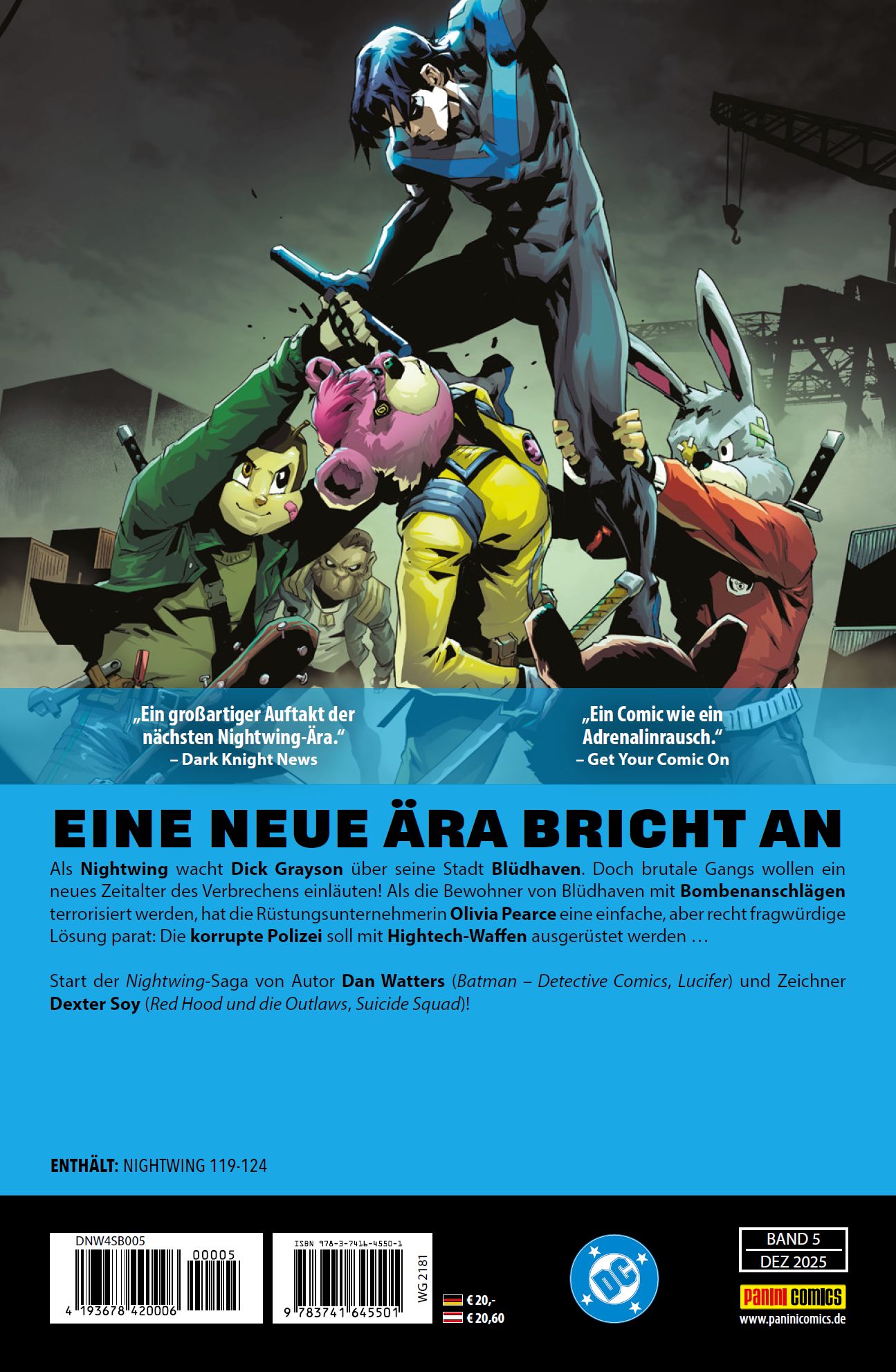 EINE NEUE ÄRA BRICHT ANAls Nightwing wacht Dick Grayson über seine Stadt Blüdhaven. Doch brutale Gangs wollen ein neues Zeitalter des Verbrechens einläuten! Als die Bewohner von Blüdhaven mit Bombenanschlägen terrorisiert werden, hat die Rüstungsunternehmerin Olivia Pearce eine einfache, aber recht fragwürdige Lösung parat: Die korrupte Polizei soll mit Hightech-Waffen ausgerüstet werden ... Start der Nightwing-Saga von Autor Dan Watters (Batman - Detective Comics, Lucifer) und Zeichner Dexter Soy (Red Hood und die Outlaws, Suicide Squad)!ENTHÄLT: NIGHTWING 119-124