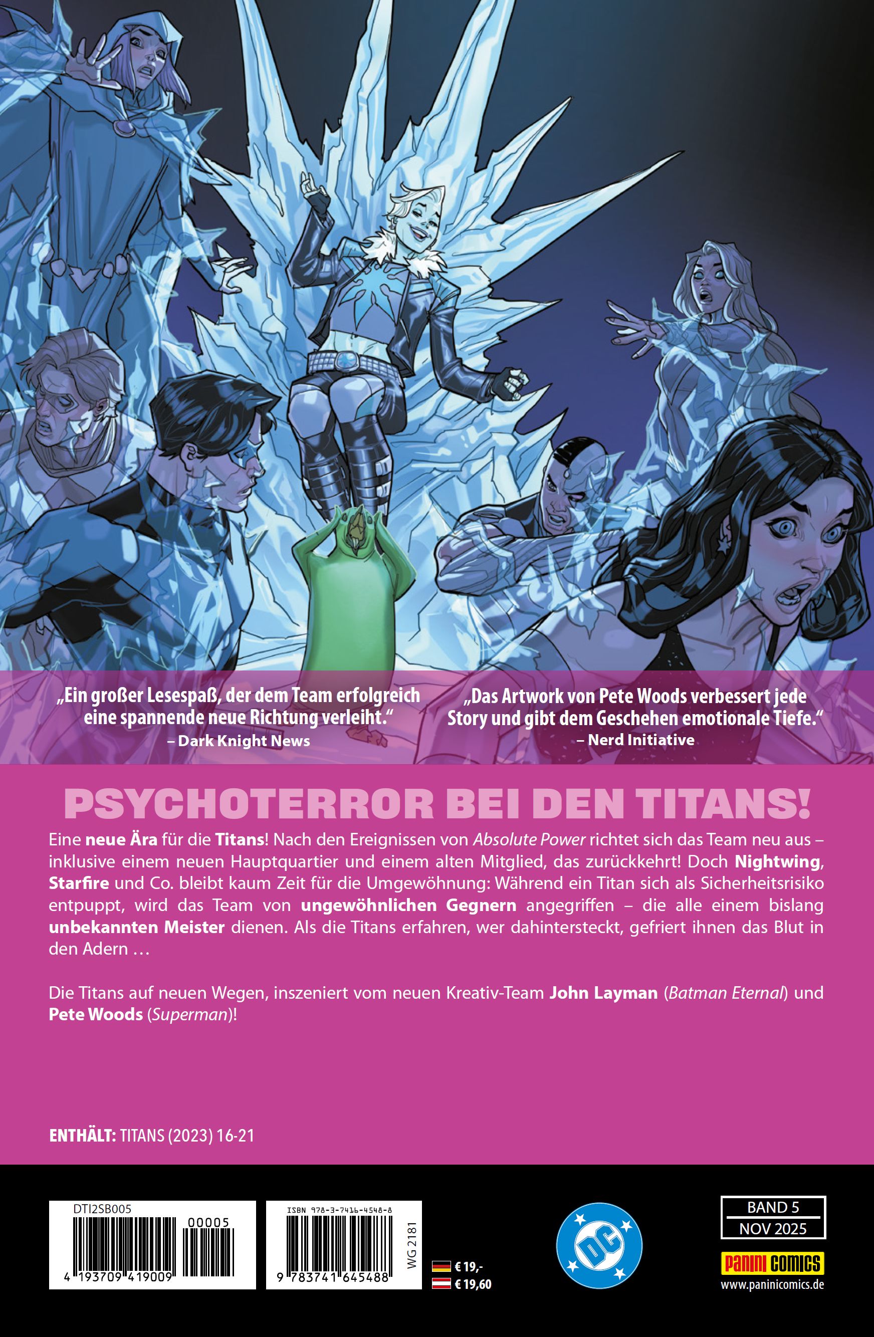 PSYCHOTERROR BEI DEN TITANS!Eine neue Ära für die Titans! Nach den Ereignissen von Absolute Power richtet sich das Team neu aus - inklusive einem neuen Hauptquartier und einem alten Mitglied, das zurückkehrt! Doch Nightwing, Starfire und Co. bleibt kaum Zeit für die Umgewöhnung: Während ein Titan sich als Sicherheitsrisiko entpuppt, wird das Team von ungewöhnlichen Gegnern angegriffen - die alle einem bislang unbekannten Meister dienen. Als die Titans erfahren, wer dahintersteckt, gefriert ihnen das Blut in den Adern ...Die Titans auf neuen Wegen, inszeniert vom neuen Kreativ-Team John Layman (Batman Eternal) und Pete Woods (Superman)!ENTHÄLT: TITANS (2023) 16-21